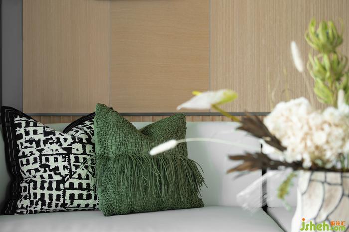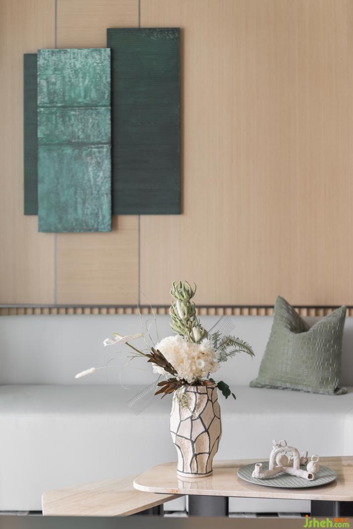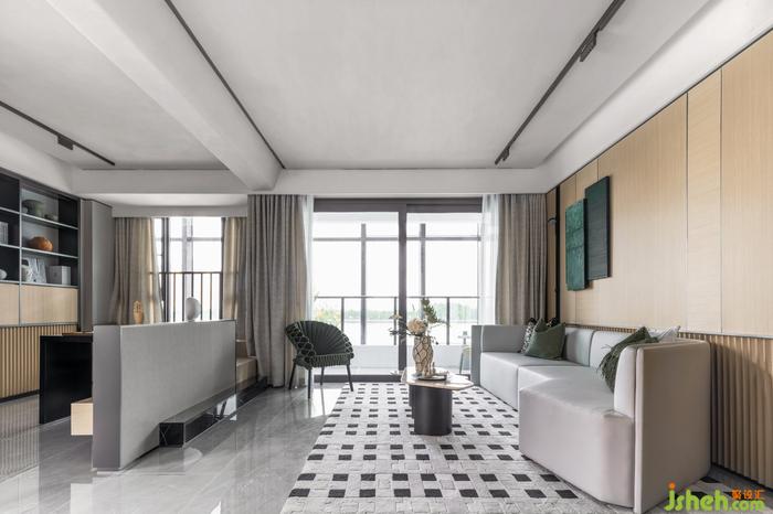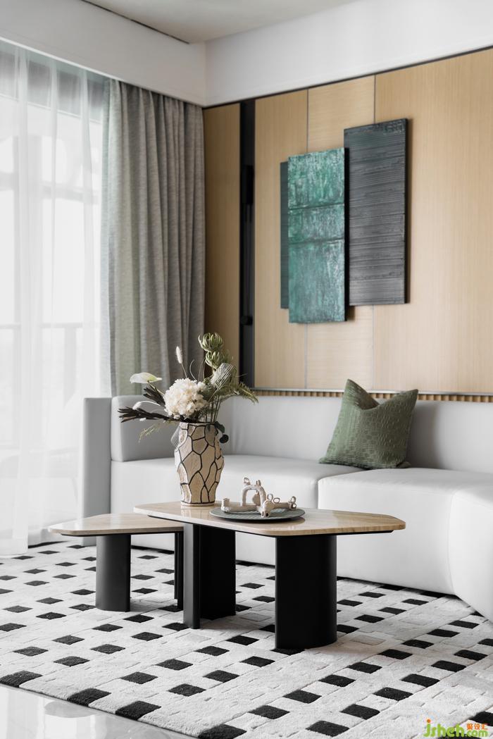 對于交流和共享屬性更高的的客廳,樣板間設(shè)計師在陳設(shè)上降低空間視覺重心,選用低矮沙發(fā)和家具,強(qiáng)調(diào)談話交流的親密感與舒適度。在多種材質(zhì)與色彩的混搭下,設(shè)計開啟生活多元的空間體驗。