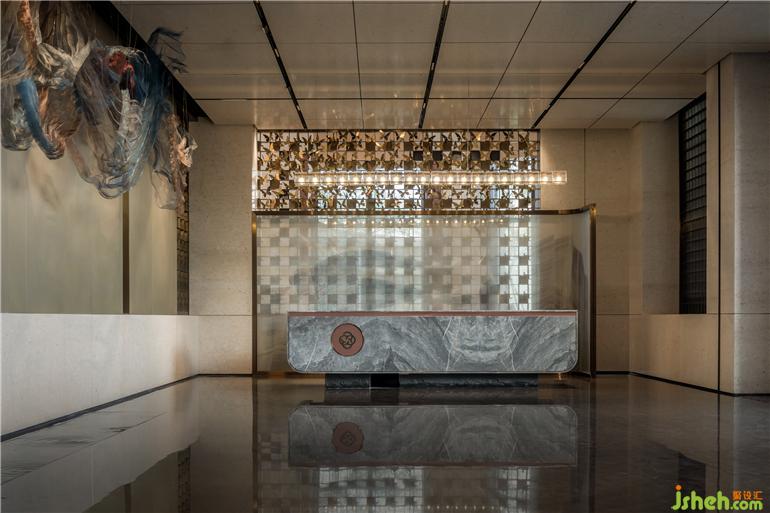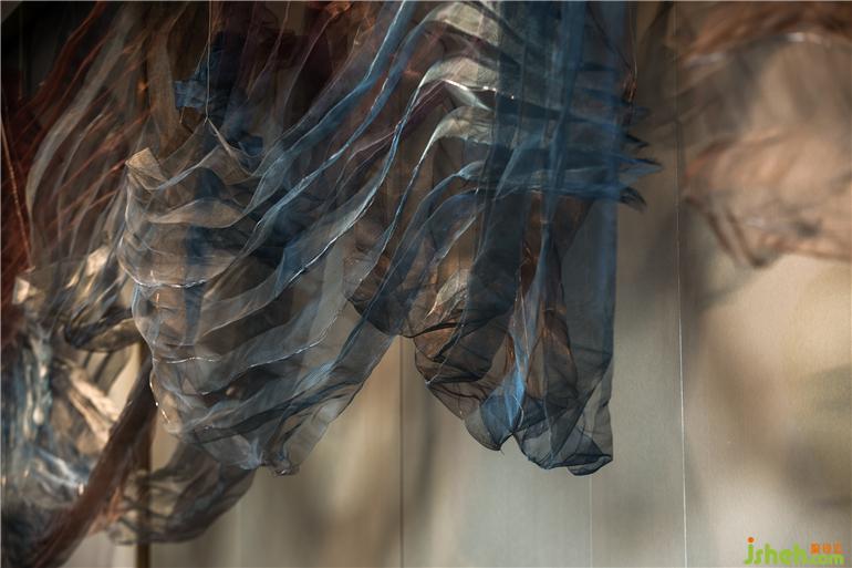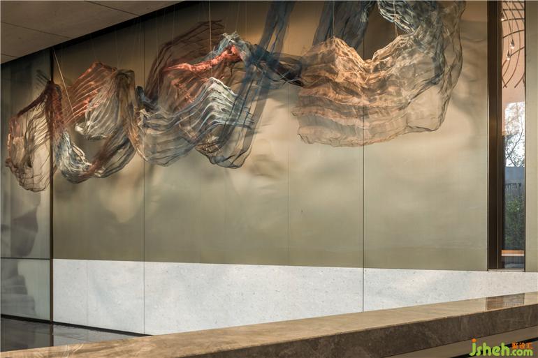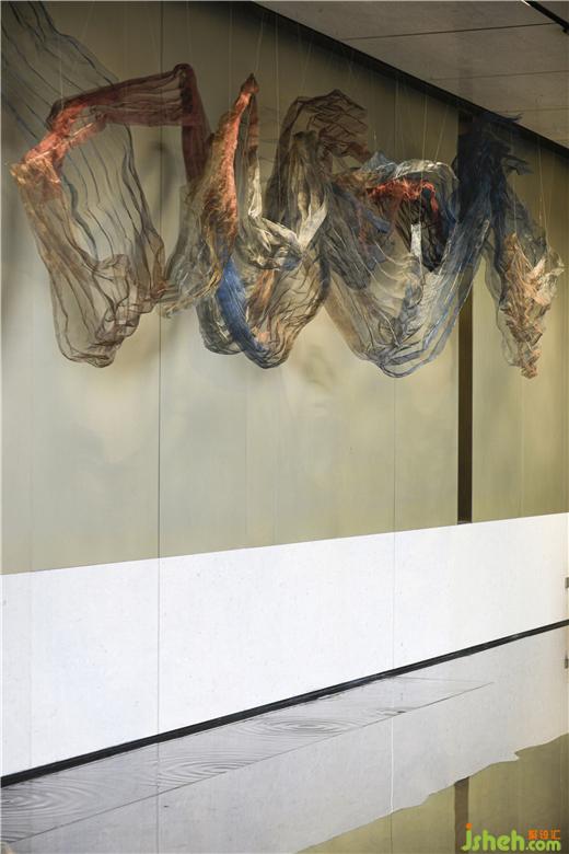 接待區(qū)不對(duì)稱的設(shè)計(jì)手法將人們的視線聚焦于一側(cè),射燈下虛幻如飄紗的裝置,靈動(dòng)的姿態(tài)不僅仿照了魚游的形,亦還原了香云紗在曬紗時(shí)隨風(fēng)擺動(dòng)的形態(tài),懸于空中又似云游,以香云紗傳達(dá)出云游的方向,配合水波紋石材的地面,引導(dǎo)動(dòng)線的深入,指引人們開啟香云之旅。