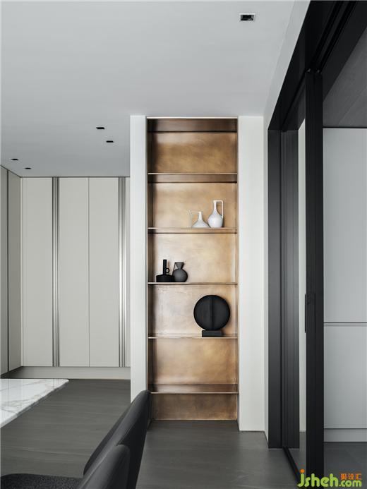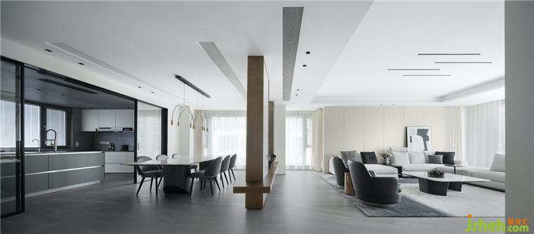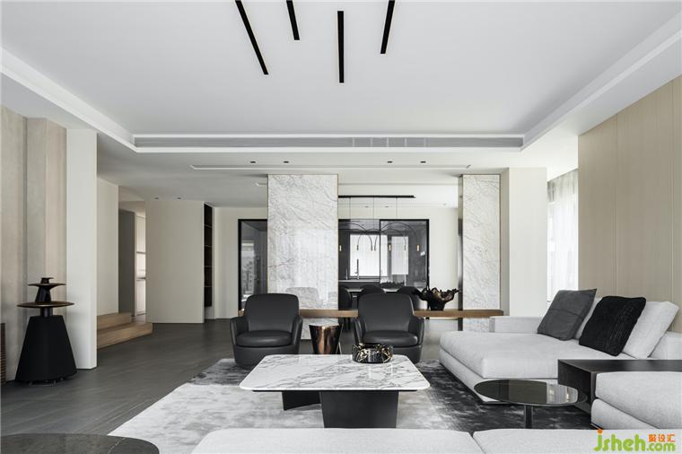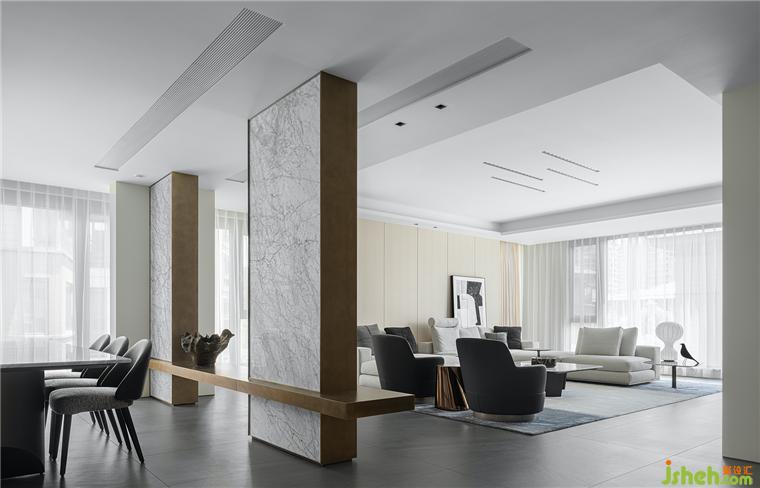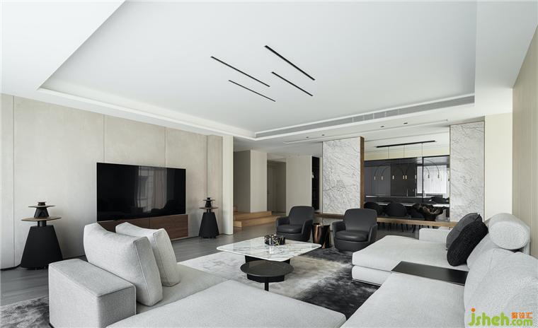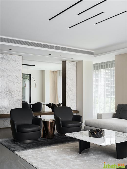 客廳是結(jié)構(gòu)主義與功能主義的完美結(jié)合之所,觀想設(shè)計以理性設(shè)計勾勒空間結(jié)構(gòu),豪宅設(shè)計用細(xì)節(jié)處理表達(dá)情感,注重韻律與秩序感的營造,于可行可望之間,介入可居可游的空間片段。