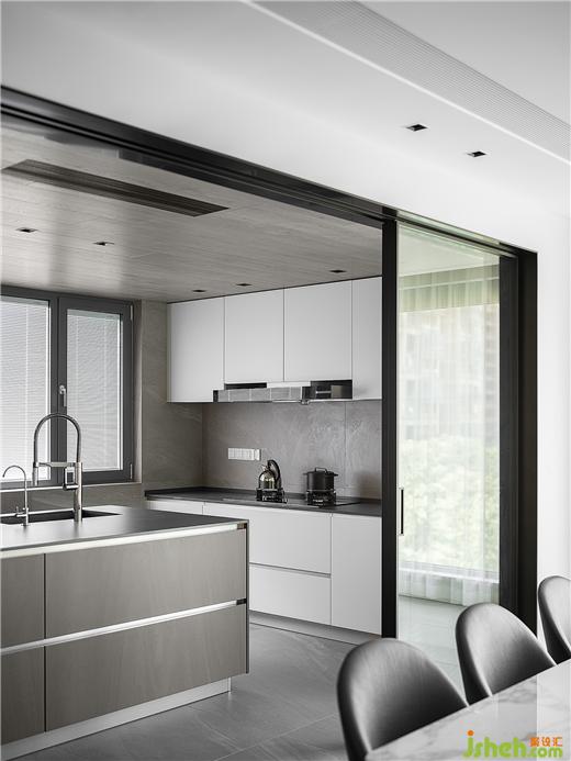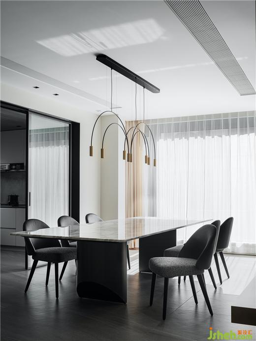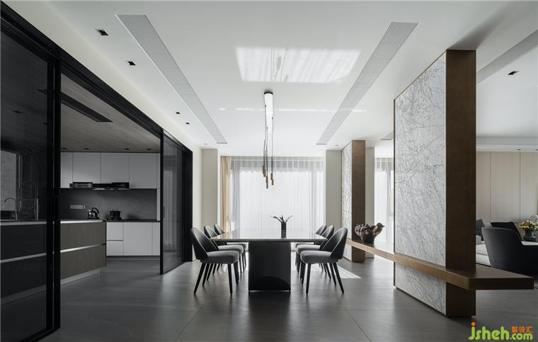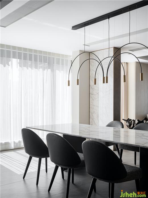 取消原有隔斷,設(shè)計(jì)師將餐廳和廚房打通,增加了自然光線的引入,同時(shí)擴(kuò)大了用餐視野,豪宅設(shè)計(jì)讓空間的構(gòu)成保持了一種更為開放和通透的可能性。當(dāng)自然光納入室內(nèi),流動(dòng)的氣韻交融,打破原有的界限。屋內(nèi)屋外,人與自然,虛實(shí)相生,詩(shī)意升騰,讓人能夠靜享當(dāng)下。