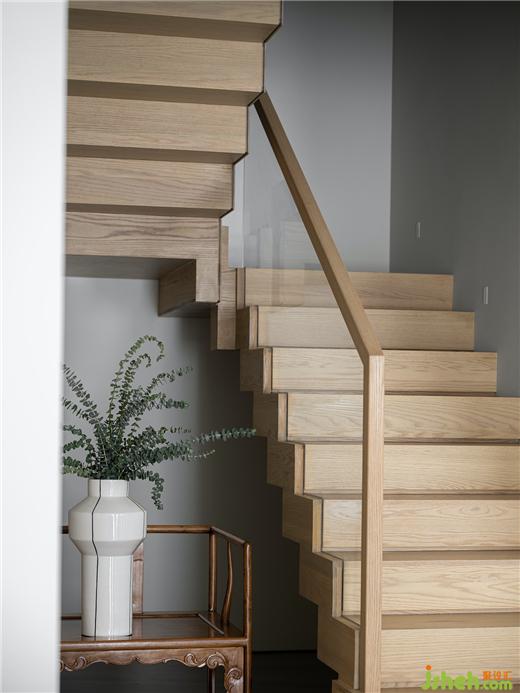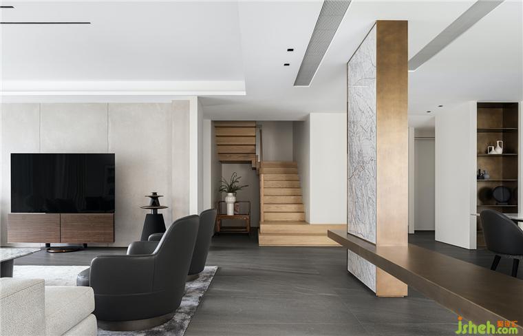樓梯坐落于客廳一側(cè),豪宅設(shè)計師運用極簡現(xiàn)代藝術(shù)的設(shè)計手法,融入木雕、木紋、中式扶手椅等人文藝術(shù),在空靈與東方意境中凝練出獨特的空間氣質(zhì)。