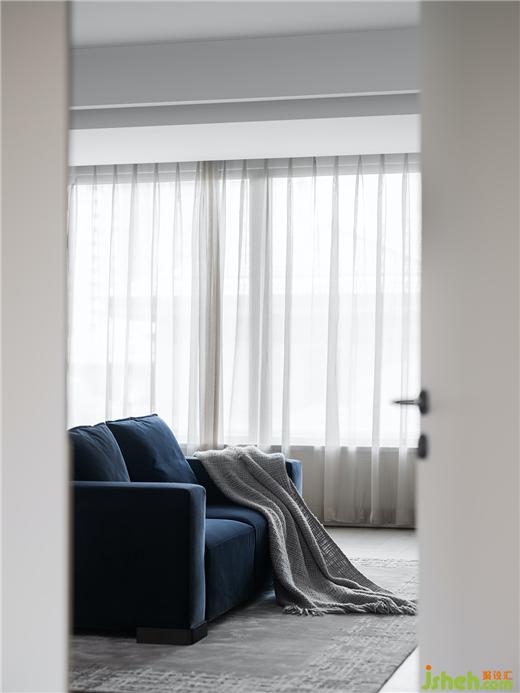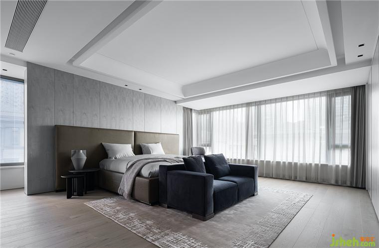 主臥室延續(xù)了公共區(qū)域的風(fēng)格,采用極簡現(xiàn)代的設(shè)計風(fēng)格,詮釋越簡單、越舒適的美學(xué)原則,全景落地窗搭配優(yōu)雅的皮質(zhì)軟包床和深藍色沙發(fā)讓整個空間清爽又高級。