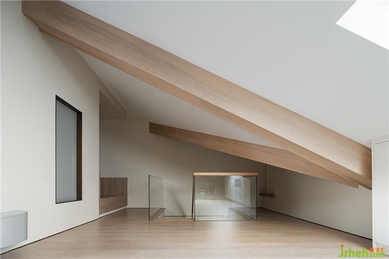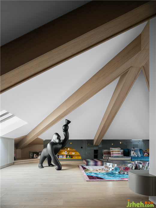 三層的閣樓上,豪宅設計師保留了原始三角頂結構,通過對稱式開天窗,在空間的體塊與樓層之間,尋找一種趣味,由此創(chuàng)建自在的尺度。