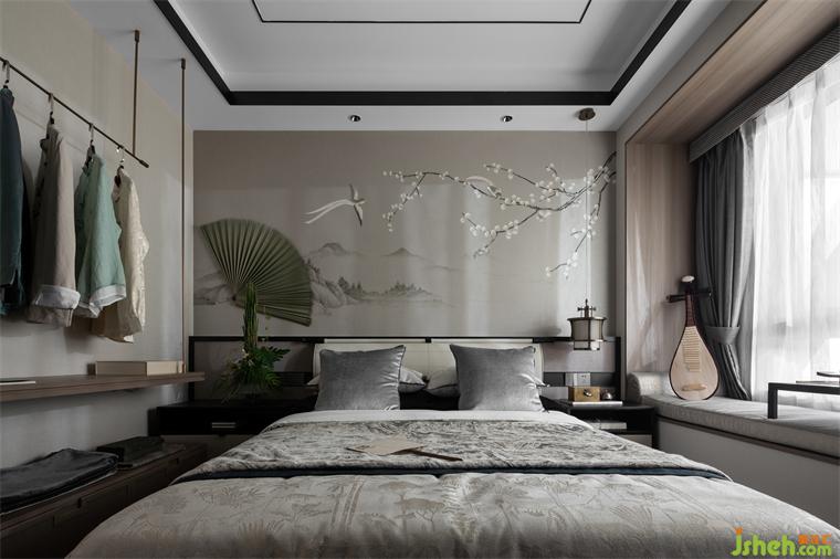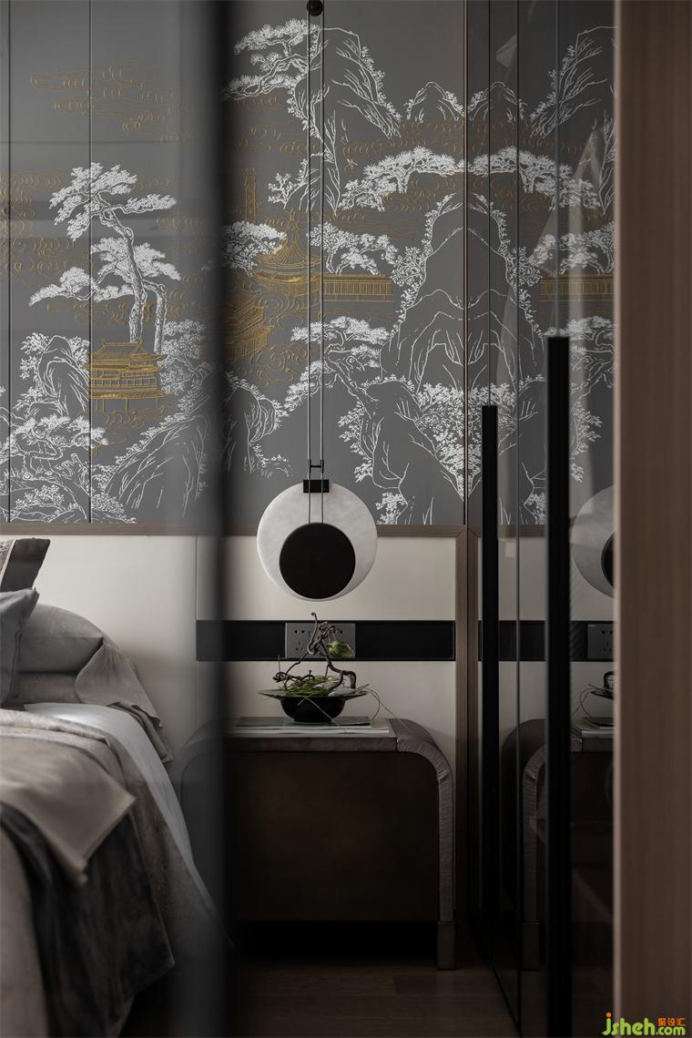 長輩房中把古典氣韻與東方禪意的格調(diào)完美展現(xiàn),床頭用不對稱的設(shè)計,一邊搭配著素雅春辰綠的折扇掛飾、另一邊則是還原了古代建筑榫卯結(jié)構(gòu)的古典燈具,與淡雅的墻面畫作相輔相成,長沙樣板間設(shè)計給人靜謐詩意、自然脫俗的感覺。