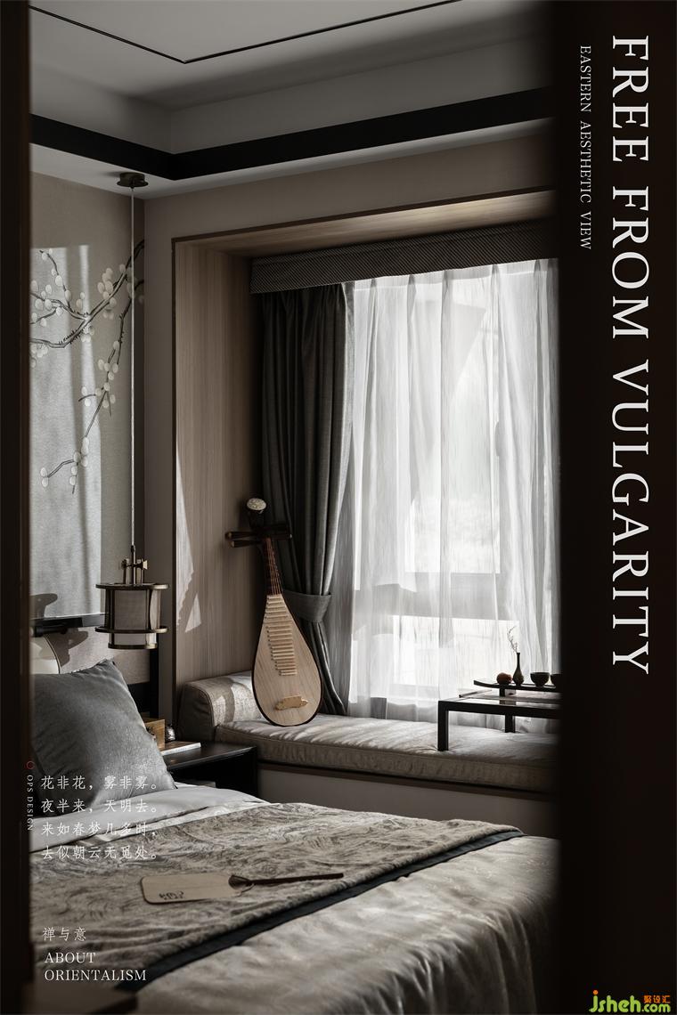 主人房里以簡約的元素表現(xiàn)東方風(fēng)格的古樸大方,將奢華嵌入軟裝的細節(jié)之中。