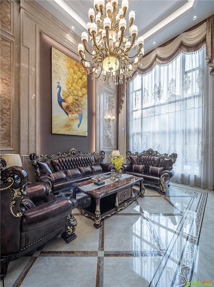 材質運用上,同色系軟包背景墻銜接大面積的石材墻面,延展空間尺度的同時,充滿轉折的美感。深褐色的沙發(fā)擺放在一幅孔雀掛畫前,整個空間的色彩層次豐富明朗。