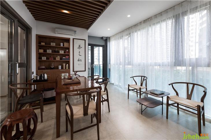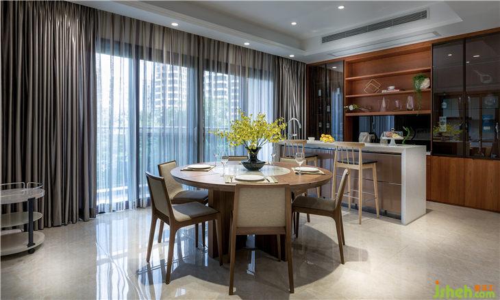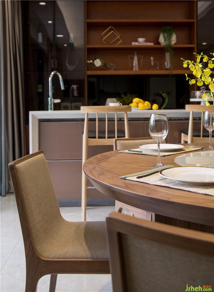 天地之間,只有光是永恒的存在,大面積的落地窗引入光。白天光線靈動(dòng)的闖入,掃盡黑夜的陰霾,使得餐廳充盈的木香余味悠長(zhǎng)。中島臺(tái)與餐廳的互動(dòng),體現(xiàn)出動(dòng)線的靈動(dòng)之處,虛與實(shí)的結(jié)合,讓生活程序完美而優(yōu)雅的呈現(xiàn)。素美的木質(zhì)餐椅與酒柜,散發(fā)著現(xiàn)代都市人在東西方文化影響下力求中庸持平的日常態(tài)度,還帶有一絲文人雅士的恬淡意味。
