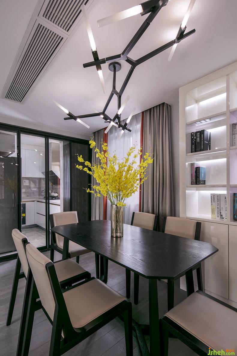 透過(guò)一扇落地玻璃的隔斷,是選自木制餐桌的樸質(zhì)生活。線(xiàn)條感的燈飾、亞麻色的窗簾與客廳、廚房的設(shè)計(jì)相互輝映。室內(nèi)設(shè)計(jì)師餐邊柜設(shè)計(jì)為到頂?shù)难b飾收納柜,內(nèi)嵌燈條的光線(xiàn)讓收藏的飾物更有展現(xiàn)視覺(jué)效果。