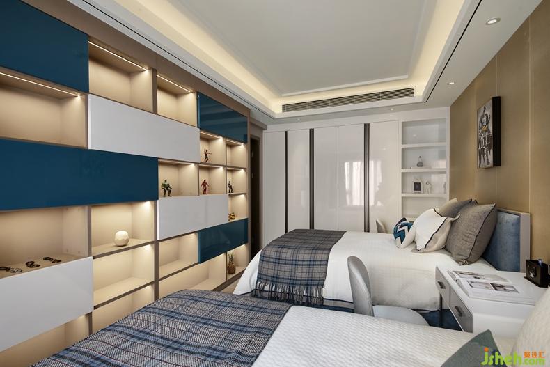 采用了整體墻面柜體的設(shè)計(jì),集展示型書(shū)柜和儲(chǔ)物功能于一體,使整個(gè)空間看起來(lái)更為整潔得體。而房間的整體布局都是以藍(lán)調(diào)為主,安謐深邃的色調(diào)是學(xué)習(xí)成長(zhǎng)的興致。