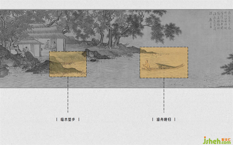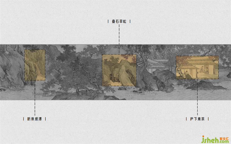 本案銷售中心設(shè)計靈感源自唐代著名畫家唐寅晚年的作品《溪山漁隱圖》。此畫描繪了唐寅在經(jīng)歷世間紛擾后,回到姑蘇城后,對悠靜自然生活的向往和追求。這與此次項目的定位相契合——創(chuàng)造一個身處繁華世界中,卻能保持內(nèi)心平靜的精神港灣?!叭雱t靜謐,出則繁華”,我們以此為理念,通過深入挖掘畫中的每個細(xì)節(jié),構(gòu)建不同功能空間的設(shè)計方案。