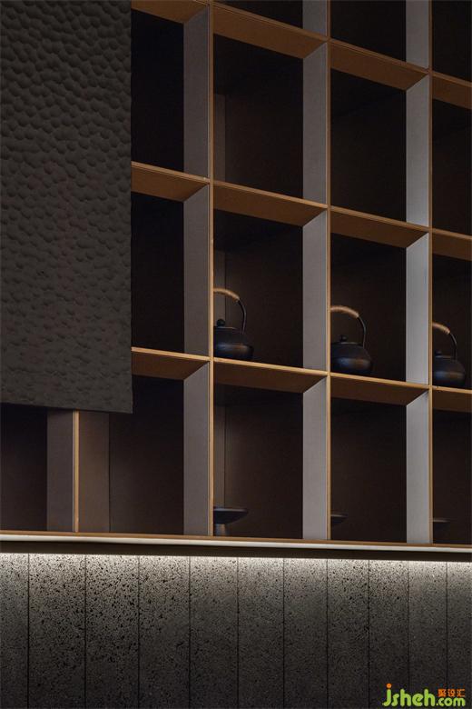 水吧臺處,茶道與品茗文化彌漫其中,營造“竹下忘言對紫茶,全勝羽客醉流霞”的風(fēng)雅氛圍,構(gòu)建出以姑蘇在地文化為基礎(chǔ)的獨特場域,融入現(xiàn)代審美觀念,使整個空間彌漫著東方韻味。深沉色調(diào)的水吧臺搭配井字格陳列柜,在滿足功能性的同時,也為人們營造了一個品味生活、體驗藝術(shù)的空間。