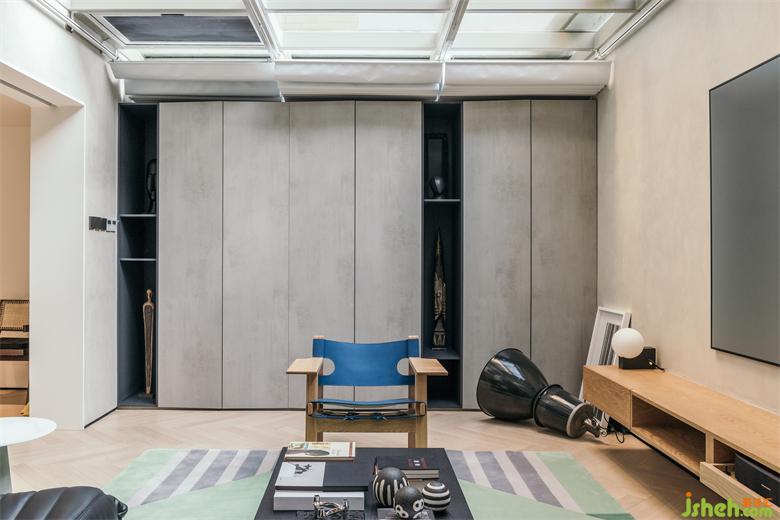 The top of the living room is clad in a glass canopy with bespoke motorized sunshades that can adjust daylight as required. A warm beam of yellow sunshine will pour into the living room in the afternoon, making it an extremely rare moment of relaxation. In the evenings, the space will be lit entirely by table lamps and floor lamps, which are also extremely romantic.