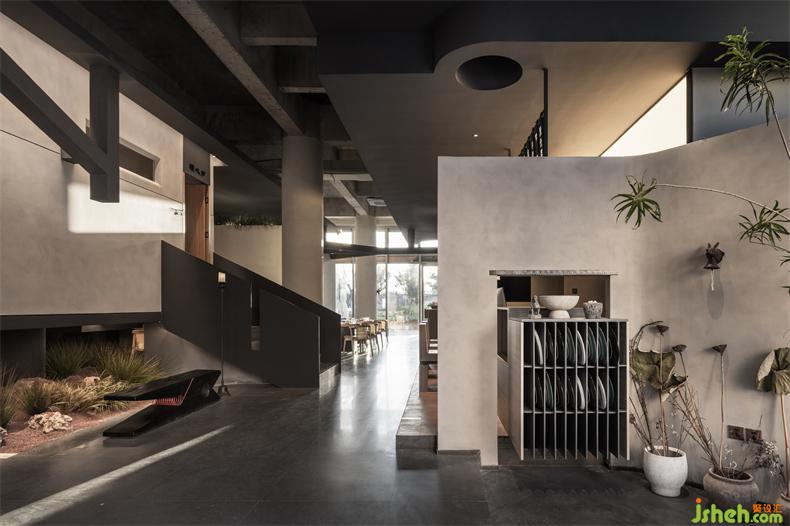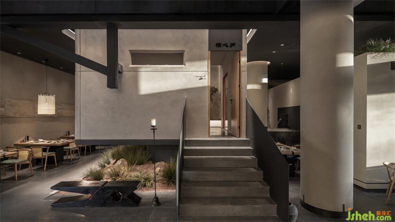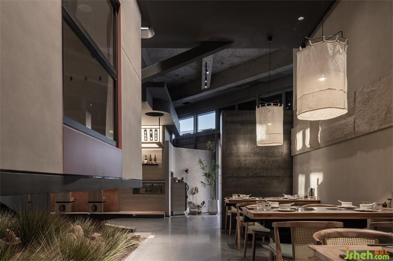 設(shè)計中將空間化零為整,打通室內(nèi)的邊界,火鍋店設(shè)計將內(nèi)空間設(shè)計漂浮,彼此架構(gòu),化身人與自然或宇宙之間更深層次的關(guān)系。為了在空間呈現(xiàn)“侘寂”中的陰翳之美,則在滿足照明需求的前提下,盡量降低了室內(nèi)光強度,在空間內(nèi)多運用開放界面和透明封閉界面,火鍋店設(shè)計將引入自然光作為主要照明方式,使自然光以投射、彌漫、消耗等多種方式自由傾灑在空間內(nèi)。