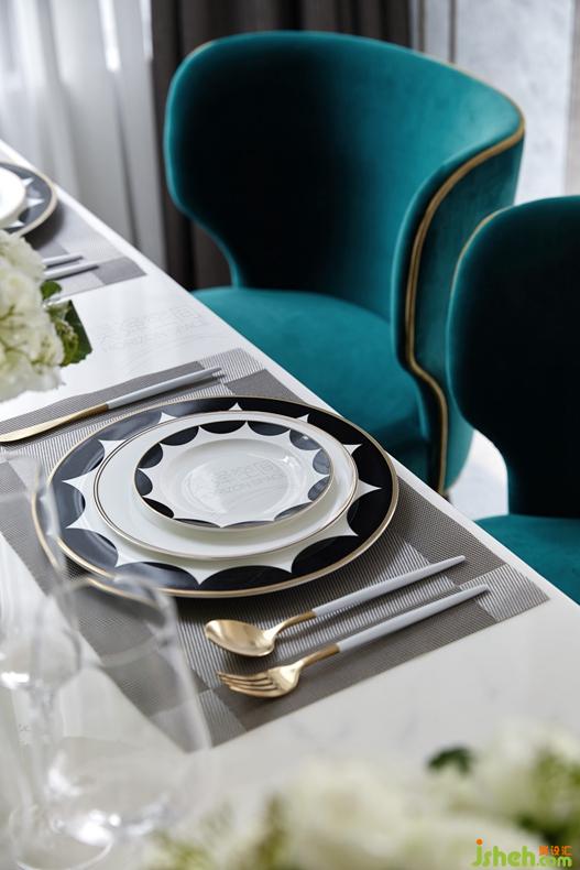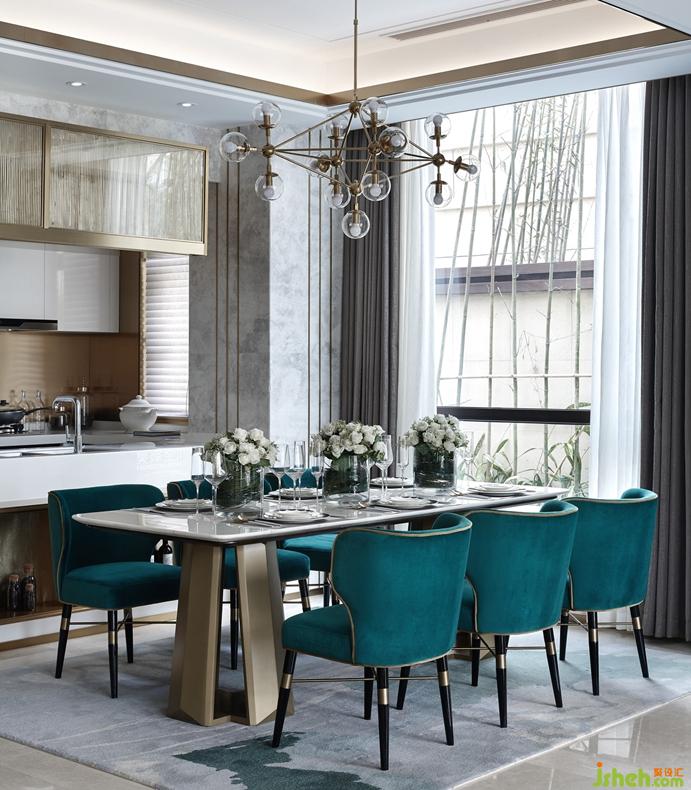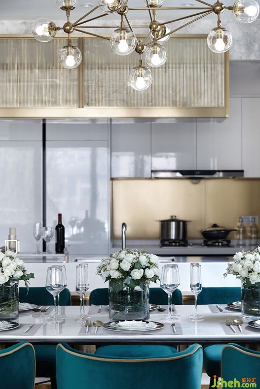 步入室內(nèi),開放式的廚房、餐廳,在空間上和客廳融為一體,增強(qiáng)了空間的流通性。餐廳是優(yōu)雅的白金色調(diào),現(xiàn)代感十足,搭配深色的科定木飾面,孔雀綠的餐椅,給整個(gè)空間增添一絲時(shí)尚活力。半島式櫥柜臺(tái),是安吉爾白大理石和鍛打銅板的完美結(jié)合,既可作為西餐的操作臺(tái),又可以作為酒吧臺(tái),符合業(yè)主當(dāng)下的生活方式。來自德國(guó)的西門子的廚房電器設(shè)備,德國(guó)Hansgrohe的廚房抽拉式龍頭和科勒的廚房臺(tái)盆,盡顯高檔生活品質(zhì)。