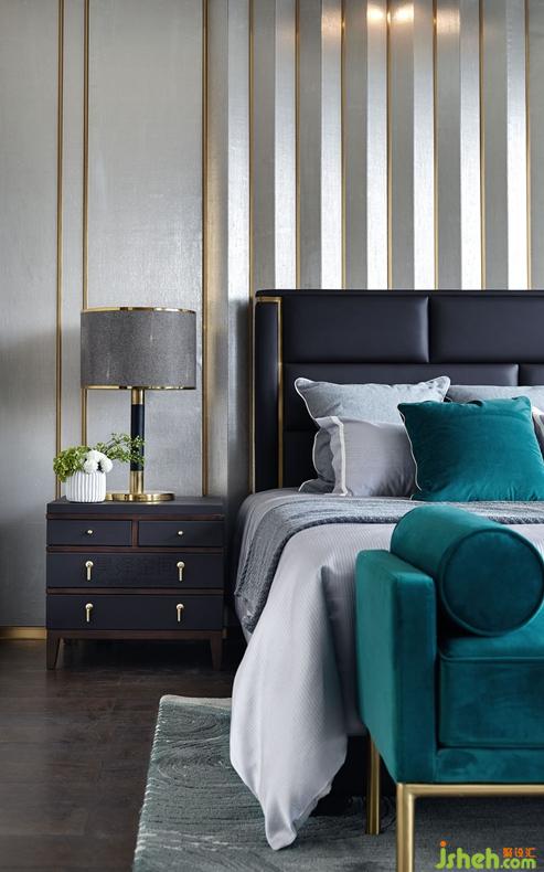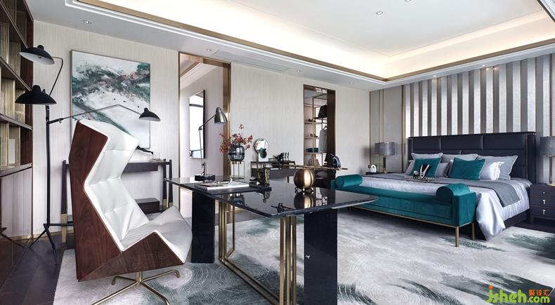 三層主臥室打破書房和臥室的界限,使得整個(gè)空間變得通透寬敞。床背景墻是米白的和咖啡色兩款墻布豎向嵌銅金屬線條造型,簡(jiǎn)約又時(shí)尚。亮金屬和黑白根大理石巧妙結(jié)合的書桌,既時(shí)尚又穩(wěn)重。鋼琴漆面的科定木飾面與厚金屬夾絲玻璃的完美邂逅,造就了書柜不俗的檔次?;蛟S在枕邊讀一本書,也可在臥室臨時(shí)辦公,符合年輕業(yè)主的現(xiàn)代化生活方式。