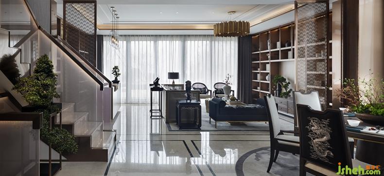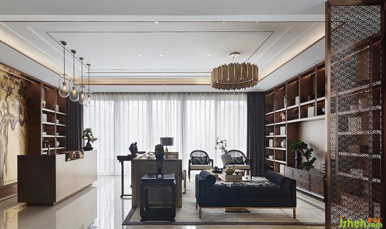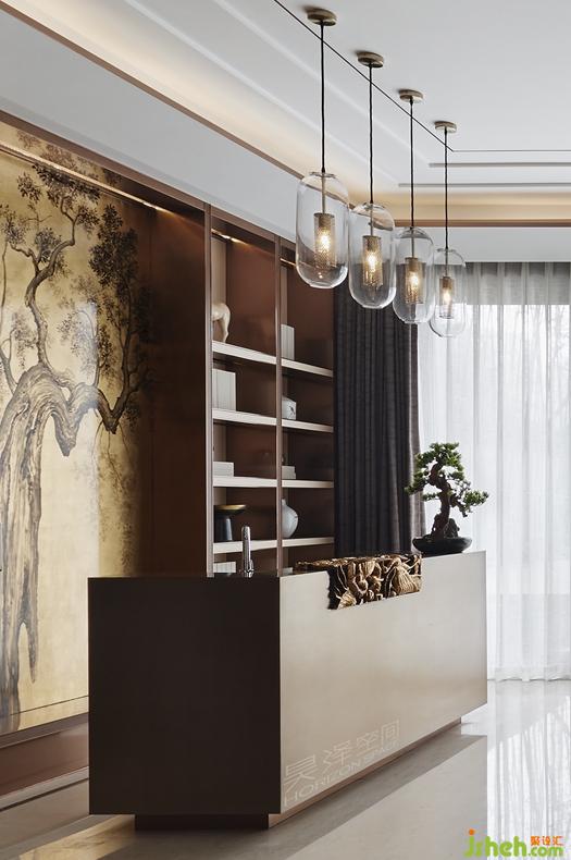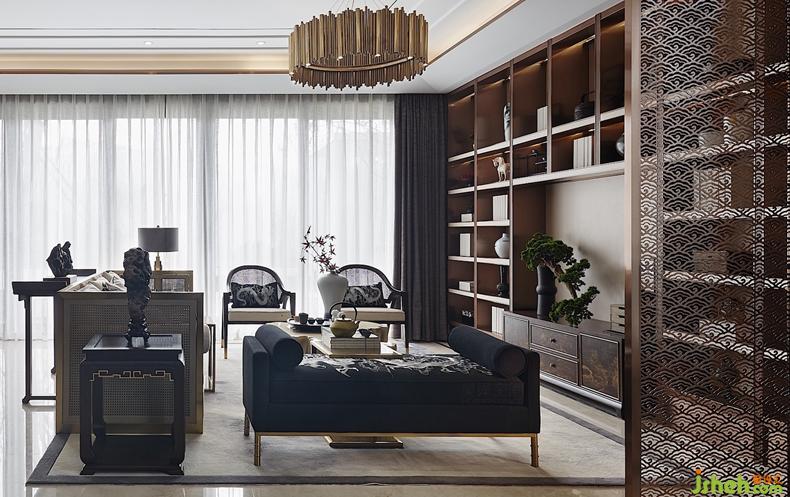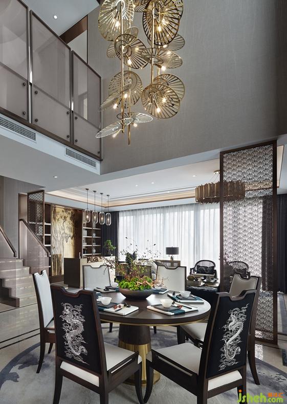 客廳布局方正,開闊明亮,全景落地窗將景色最大限度地納入空間,成為客廳中最搶眼的取景框。傳統(tǒng)的案幾,玲瓏的太湖石,李華弋的金箔畫,隨處可見的龍紋圖案等都在表達現(xiàn)代人對傳統(tǒng)、對中式的理解與體會。兩面的書柜是香檳玉大理石和拉絲古銅的完美結合,飾品精致,圖書琳瑯,營造出一種書香門第的氛圍。這樣的設計也符合業(yè)主的學識和品位。仿古銅的吧臺依靠特殊做舊工藝制造出隱隱約約的水墨圖案,又戲劇性地融合傳統(tǒng)紋樣的實木雕刻,造型新穎而獨特。抱枕和長榻的手工龍紋刺繡與電視柜的描金山水圖案互相呼應,不經(jīng)意間顯示出中式的華麗端莊。