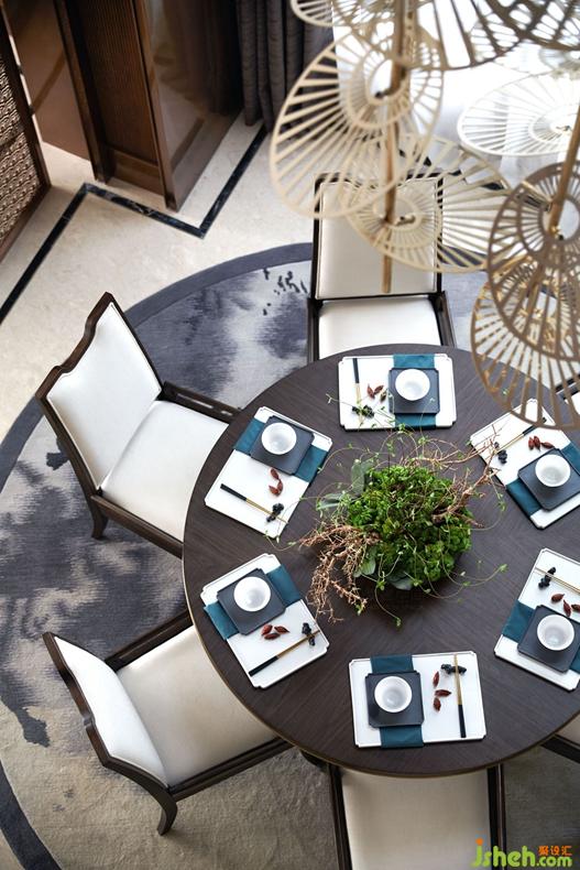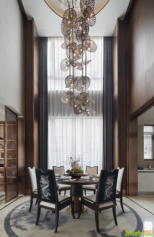 餐廳的天花運用鏡面,使空間無限延伸,倒映出蒲扇組合的藝術裝置,仿佛是從天而降散落的花瓣,錯落有致,別有一番趣味。挑高的餐廳空間透過大窗,可以看到月光,晚霞,竹林,怪石等景色。窗的兩邊伴有金屬的琥珀壁燈在柱上留下斑駁的光影,是中國傳統(tǒng)燈籠的演化。墻面是深色的科定木飾面,低調而深沉。餐椅背板的龍紋刺繡和精選水墨地毯詮釋著中式韻味。來自德國的西門子的廚房電器設備,德國Hansgrohe的廚房抽拉式龍頭和科勒的廚房臺盆,盡顯高檔生活品質。