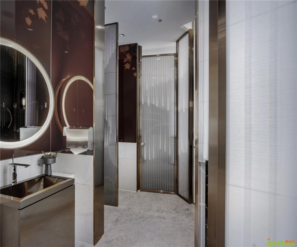 “池碎瀑聲荷捧雨,徑涵秋影篁篩月?!?nbsp;兼容中式美學與現(xiàn)代主義的極簡法則,洗手臺的設(shè)計以朱紅與古銅、灰色與素白描繪空間。一輪圓月鏡將內(nèi)外的光景各自框成一幅畫面。