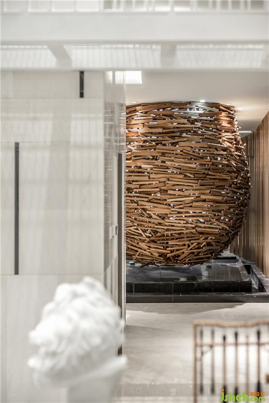 地下二層是逍老師的藝術工作區(qū),一側懸挑的“孤鳥”之巢造型茶室外觀,“與我無關”的個性存在,契合逍老師的心境,思考、獨處、想象,“涉事”,隨意做了一些創(chuàng)作而已。