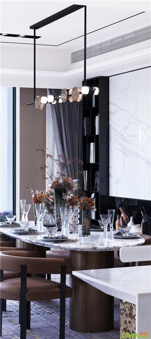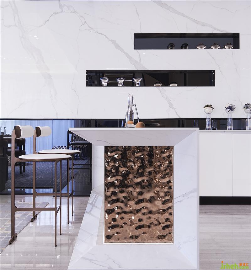 一層開敞的空間同時容納了客廳、餐廳及西廚的功能,開放的交互關(guān)系增進了情感交流,這種愉悅的空間氛圍如同譜寫樂章,在美感的引導下,把偶然的事件變成一個主題,然后記錄在生命的樂章中。猶如作曲家譜寫奏鳴曲的主旋律,人生的主題也在反復出現(xiàn)、重演、修正、延展。