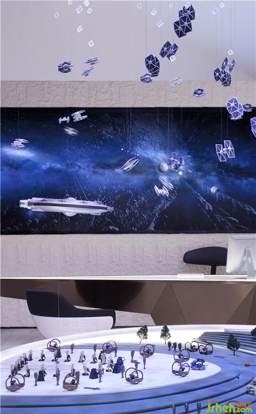 “星球大戰(zhàn)”三部曲的風(fēng)格視效貫穿了整個(gè)工作室空間,銀河系主題裝置和星戰(zhàn)對(duì)戰(zhàn)沙盤作為整個(gè)空間的視覺焦點(diǎn)。