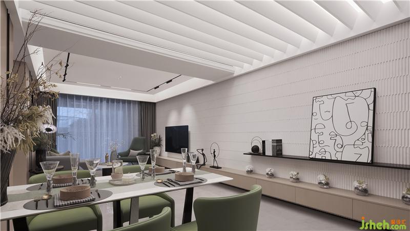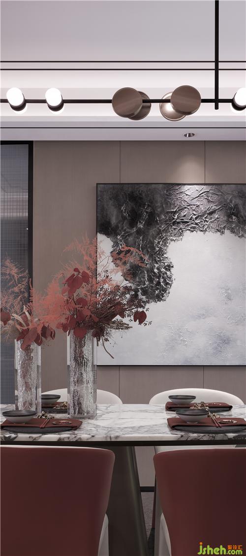 客廳通透開敞,墻面上的抽象畫作與餐桌的藝術(shù)品形成空間對話,體現(xiàn)出多層次的趣味性。