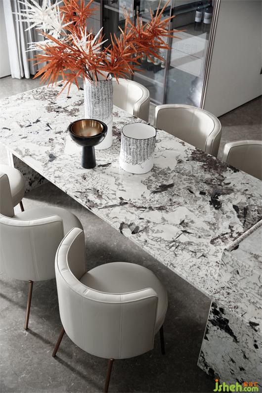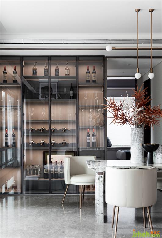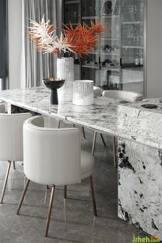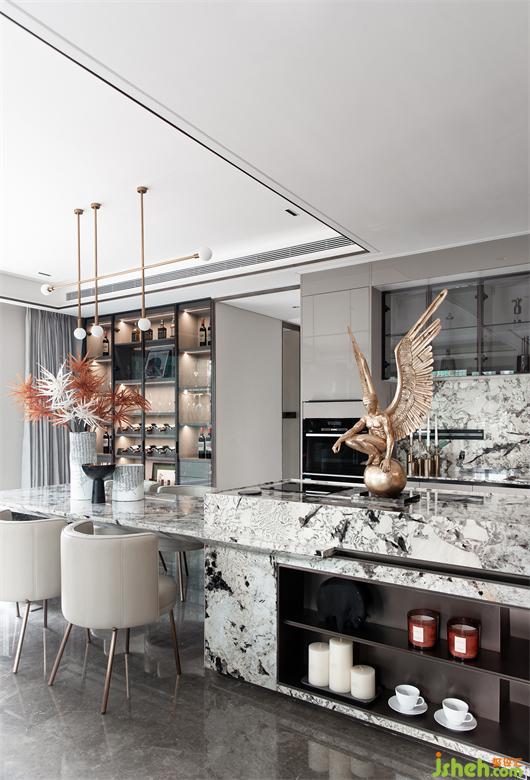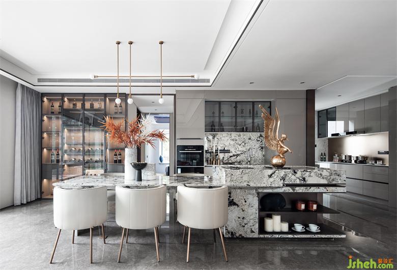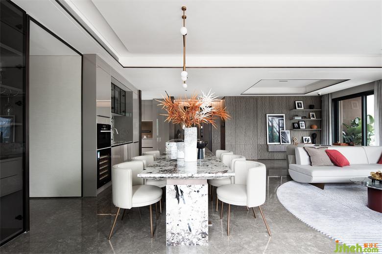 整個家庭的社交中樞:會客、就餐、廚房位于一條軸線,南北通透、動靜分明,在“場域化社交”中還原家庭空間的場景化。大尺度公區(qū)內,安排了“會客區(qū)”、“私宴區(qū)”、“島臺區(qū)”和“奢尺烹飪區(qū)”,大方廳270°落地玻璃全景陽臺,則是完美的“自定義空間區(qū)”。