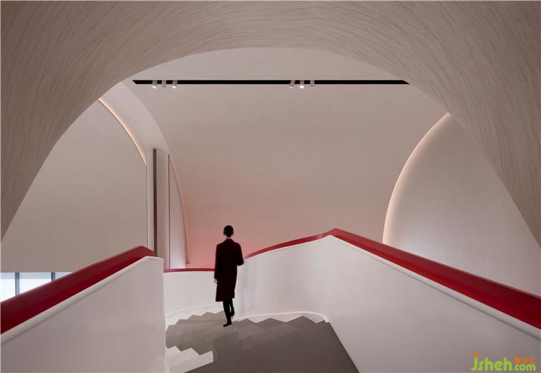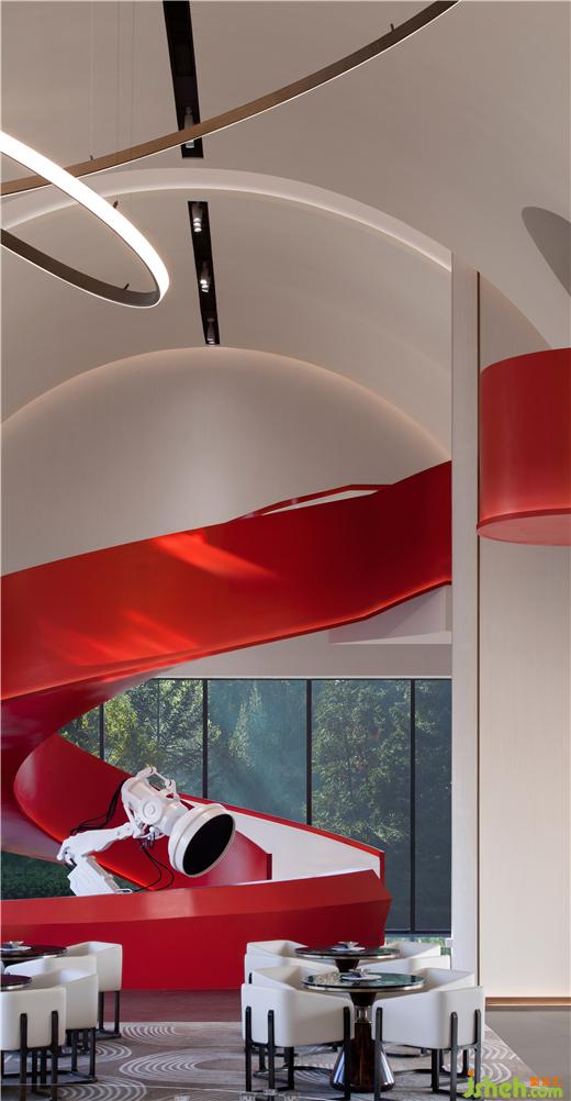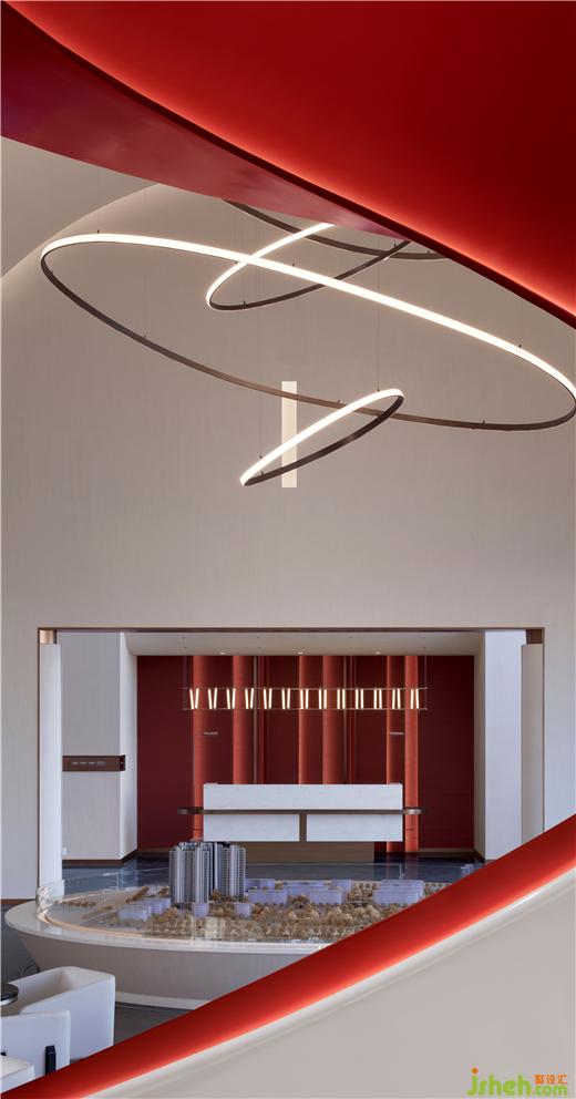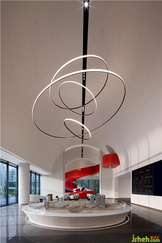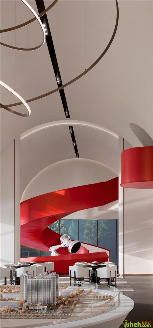 售樓處設(shè)計通過造型的層疊,把沙盤上的主吊燈,洽談區(qū),以及視覺終端的造型樓梯串聯(lián)起來,營造出一重又一重的空間遞進(jìn)感。