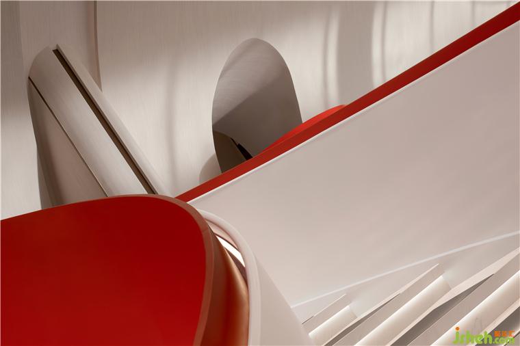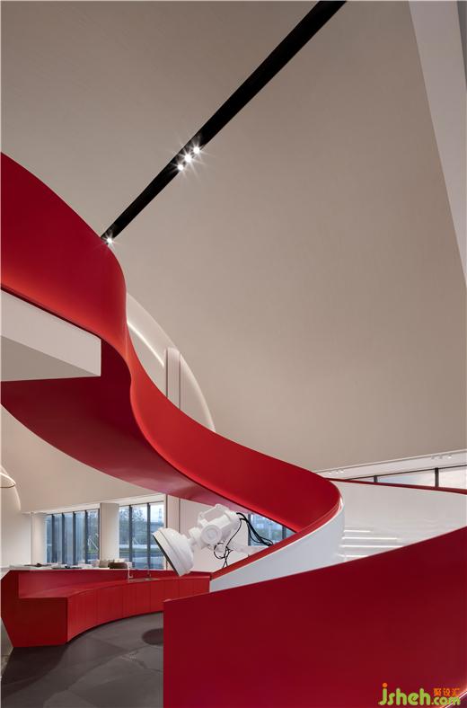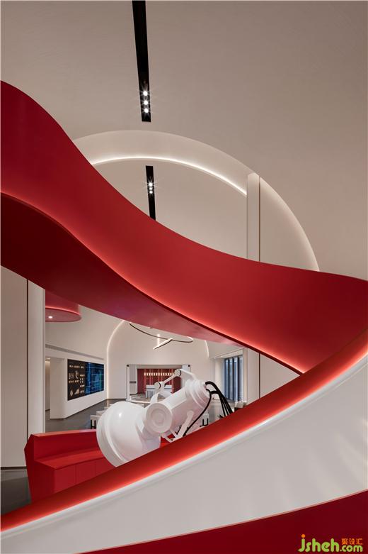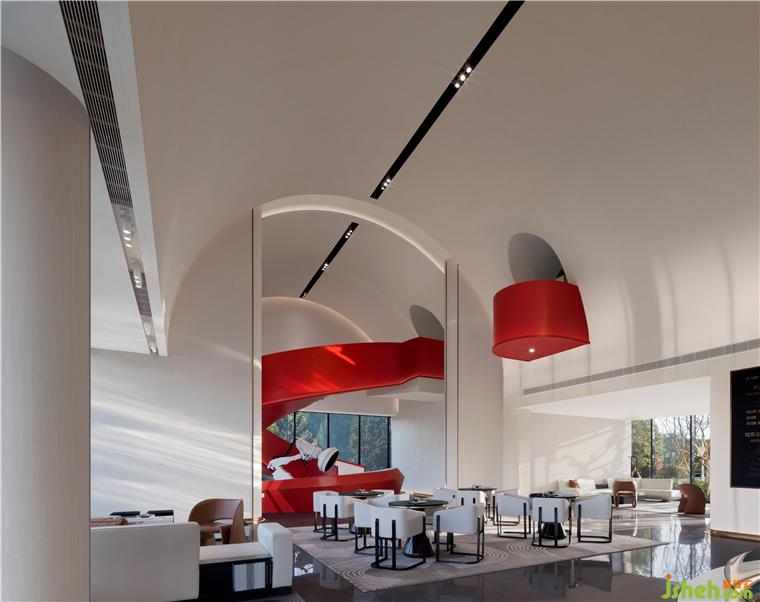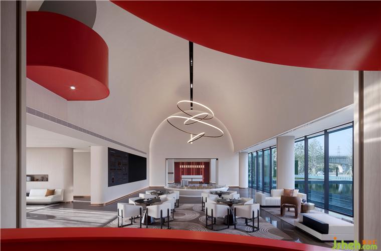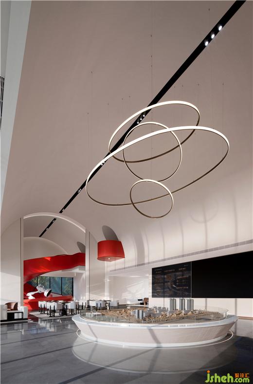 鮮艷的主題色在素雅的空間中分外奪目,整個(gè)主題造型好似飄帶,又宛若蛟龍,拔地而起,穿過連廊,再從洽談區(qū)這邊探出一截,售樓處設(shè)計(jì)不僅成為連接樓上樓下的紐帶,還以其優(yōu)美獨(dú)特的造型形成整個(gè)空間最重要的亮點(diǎn)。