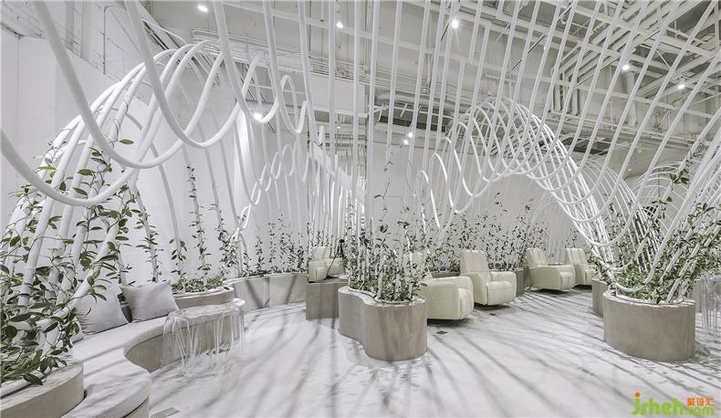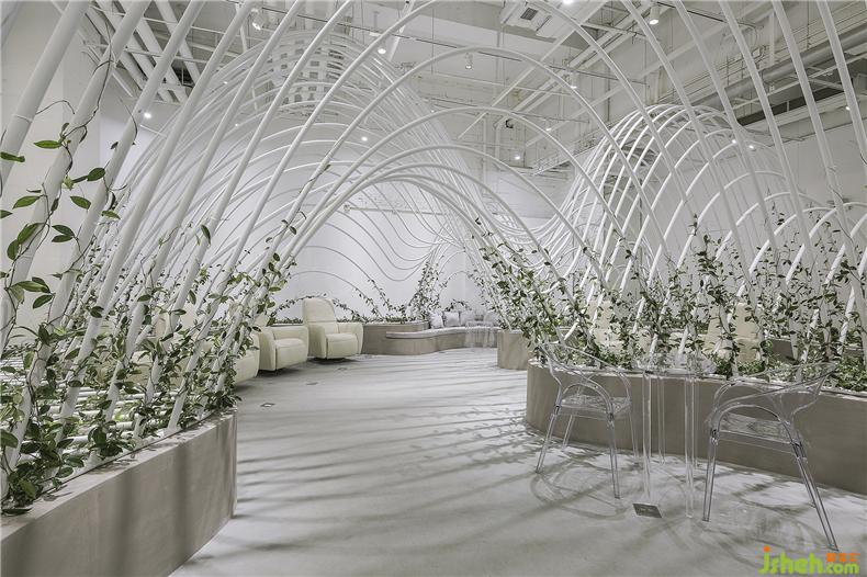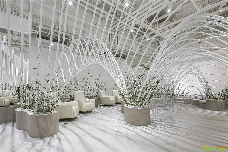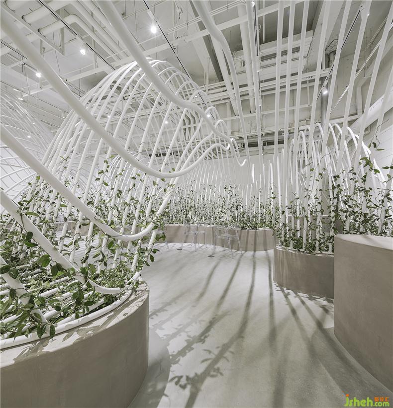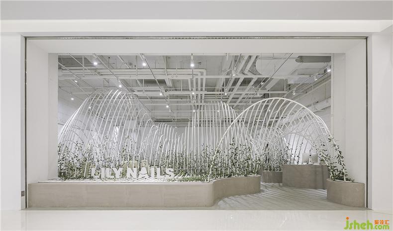 設計首先將整體空間劃分為公共和私密兩部分。室內(nèi)設計師公共部分為開放植物園。根據(jù)接待、等候、美甲、活動等功能生成10個大小不一的“山丘”,“山丘”互相聯(lián)通形成開放流動的路徑,使用直徑32mm、壁厚3mm的白色鍍鋅鋼管勾勒出連綿起伏的“山丘”輪廓,從地面升起的550mm高水泥臺,將抽象的“山丘”輪廓放置其上,沿水泥臺四周布置爬藤植物,室內(nèi)設計師綠色的球蘭藤蔓沿著“山丘”的輪廓線生長,生機盎然的提醒著時間和空間的變化。
