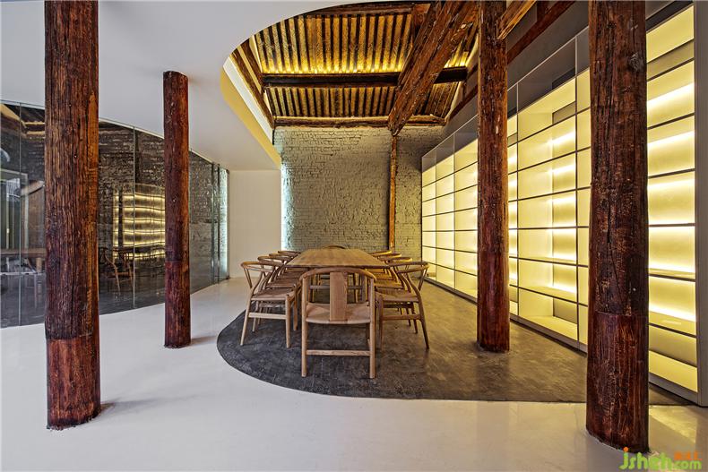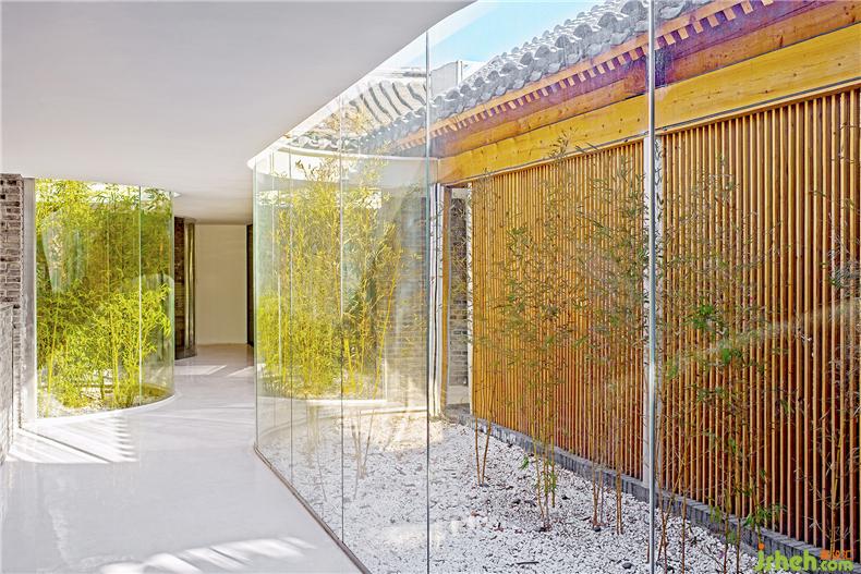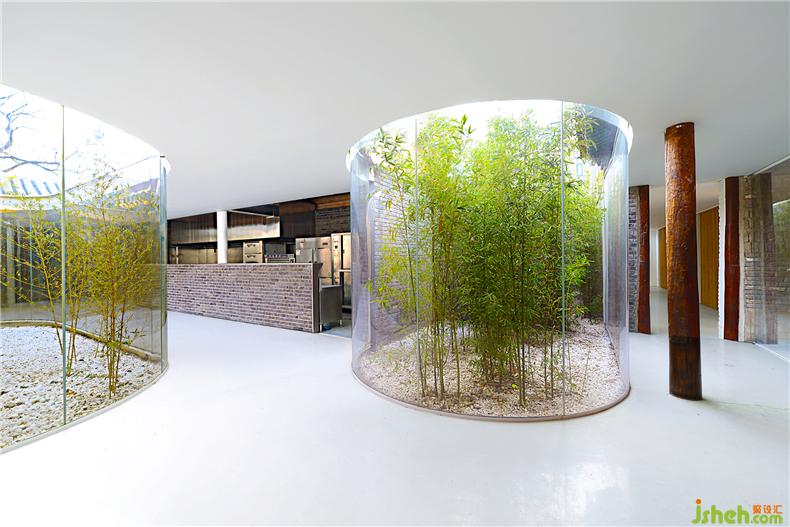 2.植入新的。舊有的建筑格局難以滿足當代環(huán)境的舒適性要求,室內設計師新的建筑必須能夠完全封閉以抵御外部的寒冷。為此,我把建筑中的流線視覺化,轉化為“廊”的形式,在舊有建筑的屋檐下加入一個扁平的“曲廊”將分散的建筑合為一體,創(chuàng)造新舊交替、內外穿越的環(huán)境感受。在傳統(tǒng)建筑中,廊是一種半內半外的空間形式,它的曲折多變、高低錯落,大大增加了游園的樂趣。猶如樹枝分岔的曲廊從室外伸展到舊建筑內部,模糊了院與房的邊界,改變院子呆板狹窄的印象。輕盈、透明、純白的廊空間與厚重、滄桑、灰暗的舊建筑形成氣質上的反差,新的更新、老的更老,拉開時間上的層疊,新與舊相互產生對話。曲廊在原有院子中劃分了三個錯落的弧形小院,使每一個茶室有獨立的室外景致,在公共和私密之間產生過渡。曲廊的玻璃幕墻好似一個懸浮地面之上的弧形屏幕,茶樓設計將竹林景觀和舊建筑形式投射到茶室之中,新與舊的影像相互疊加。曲廊同時具有舊建筑的結構作用,廊的鋼結構梁柱替換了局部舊建筑中腐朽的木材,使新與舊“長”在了一起。