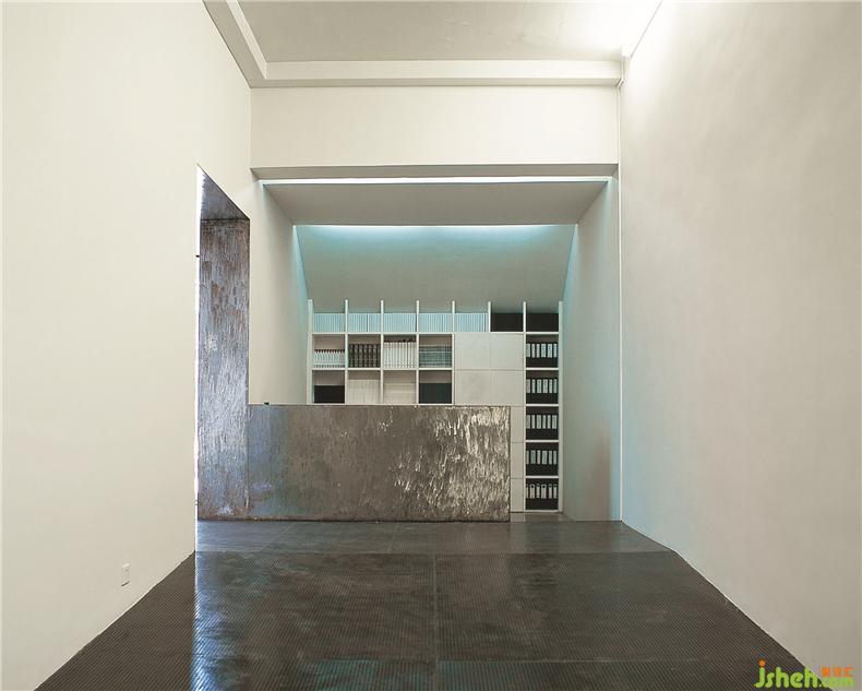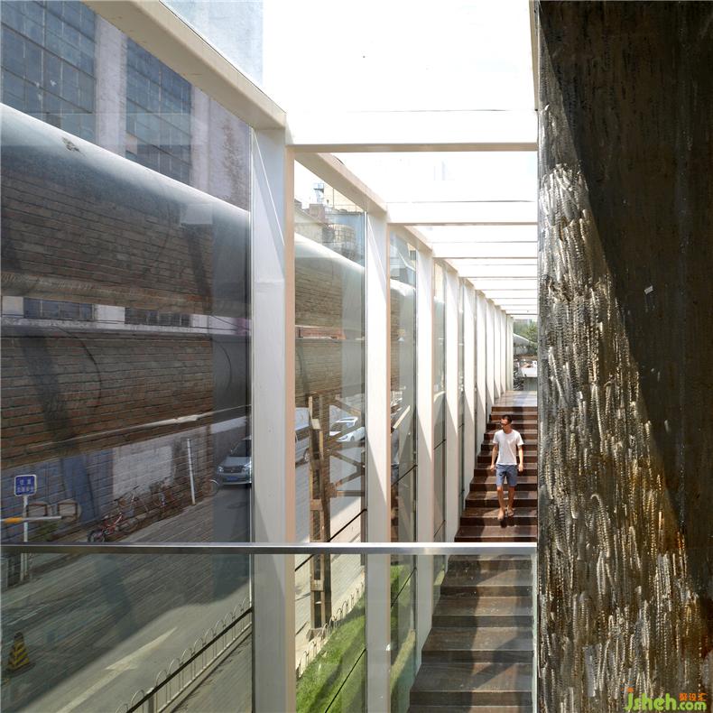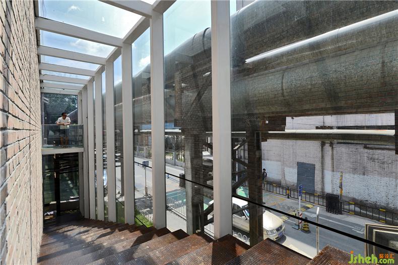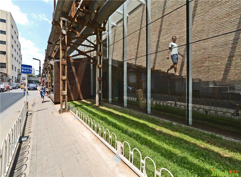 利用建筑外側(cè)供熱管道的縫隙,加建一個中介空間,裝修設(shè)計創(chuàng)造嶄新的畫廊形象。由銹蝕金屬網(wǎng)孔板構(gòu)成 “入”字形結(jié)構(gòu)就像漂浮于磚墻之外的空間裝置,一側(cè)折疊為主入口和雨篷;另一側(cè)成為建筑內(nèi)部樓梯。鏡面玻璃幕墻映射街道環(huán)境,裝修設(shè)計改變展廳封閉的印象,活躍內(nèi)外視覺聯(lián)系。