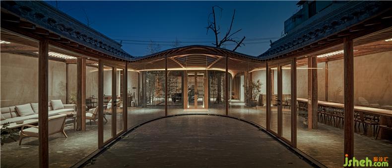 三進(jìn)院作為居住院,包括兩間臥室以及茶室、書房等空間。別墅裝飾舊建筑依然是一正兩廂的格局,院內(nèi)有三棵老樹。游廊平面在這里演變?yōu)檫B續(xù)曲線形態(tài),一方面與庭院內(nèi)的三棵樹產(chǎn)生互動(dòng),另一方面也營造出多個(gè)小尺度的弧形休閑空間。兩間臥室居于建筑最后面的房屋,室內(nèi)根據(jù)屋脊呈對(duì)稱式布局,兩個(gè)衛(wèi)生間均與小院子比鄰,實(shí)現(xiàn)良好的采光和通風(fēng)效果。