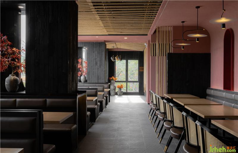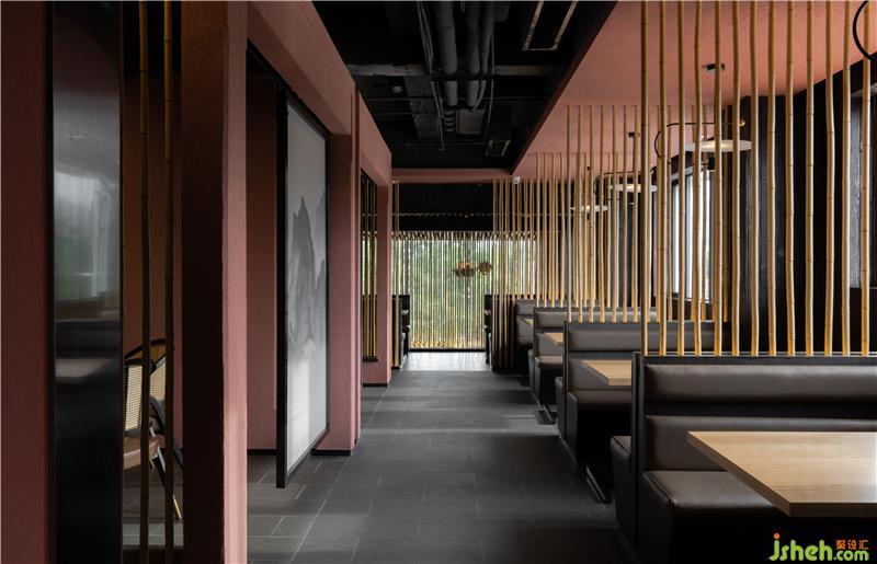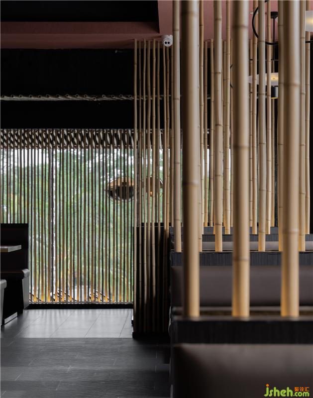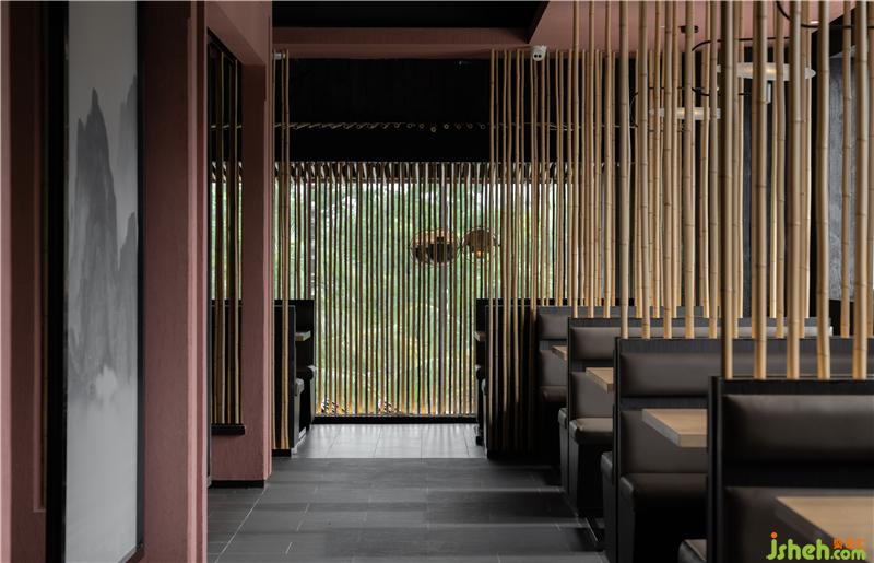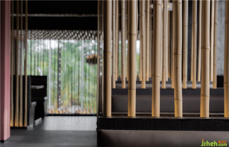 整體餐廳設(shè)計(jì)氛圍可隨著就餐模式自由切換;室內(nèi)暖紅色的夯土,光影婆娑的竹子,融合散發(fā)著安靜、內(nèi)斂、質(zhì)樸的氣息。纖纖細(xì)竹交織成天花和屏風(fēng),在精心鋪設(shè)的藏?zé)舻妮x映下,呈現(xiàn)出簡約而多變的圖案。這種分隔粒子的尺度恰到好處,在餐廳設(shè)計(jì)空間被分隔的同時(shí),視線和空氣卻在空間中穿梭和流通。