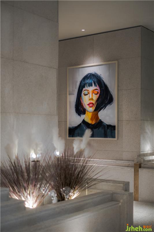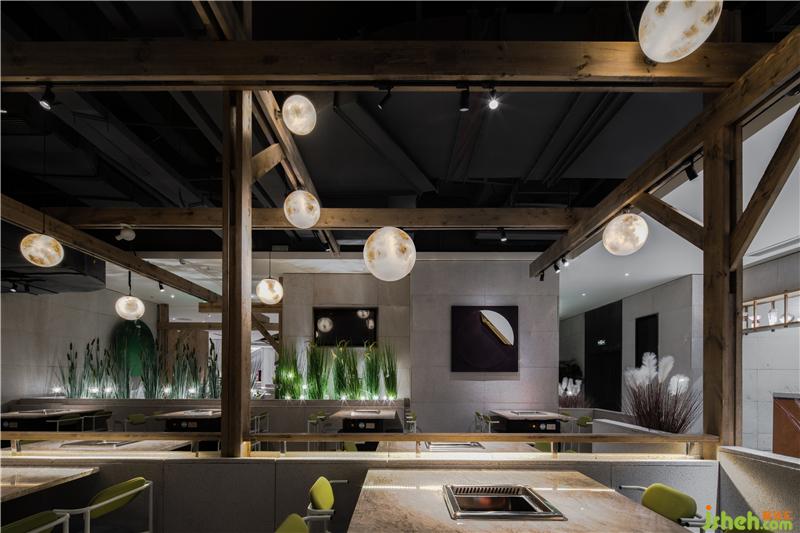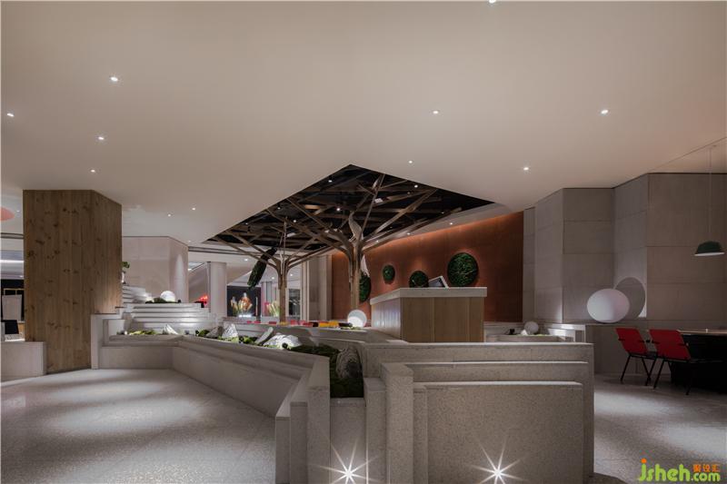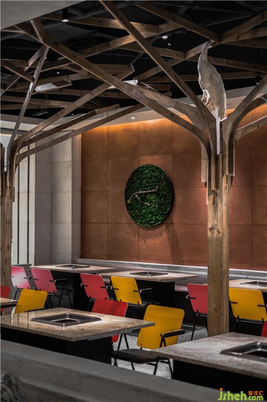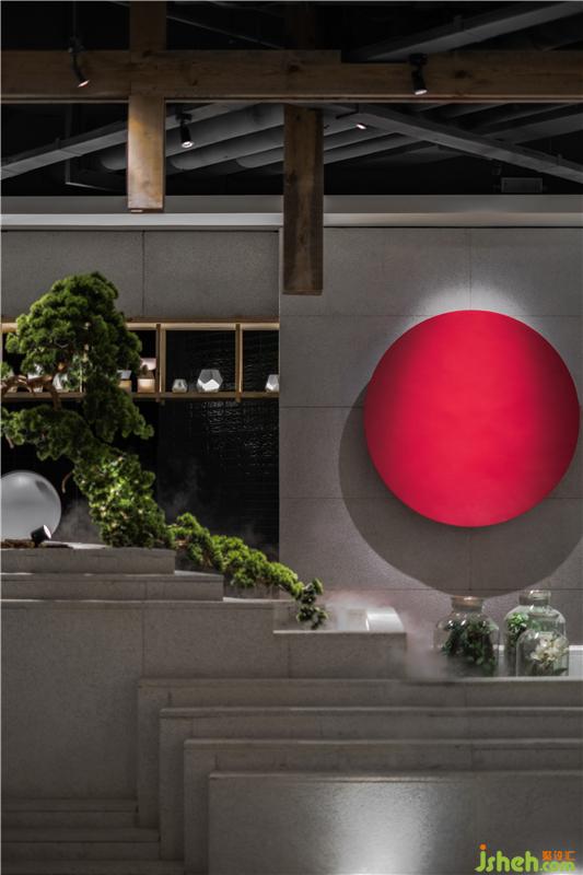 “星球墜落”被充滿神秘和夢幻色彩的星球包裹著,卯榫交錯的木制構(gòu)件,驚現(xiàn)的巨型球型裝置燈,虛實交錯,被綠植切割出一個讓人錯覺的一個獨立空間,東方氣質(zhì)與當(dāng)代語言的一次大膽碰撞?!吧止鳌眳^(qū)域被層層遞進的綠苔景觀池分隔違和,置身戶外一般,樹干錯綜復(fù)雜的曲線被簡化成豎直的原木裝置,墻面的紅砂巖如同芬芳的泥土,質(zhì)樸而雅致,驕傲的孔雀公主矗立在森林中,預(yù)示著現(xiàn)代女性驕傲而熱愛美麗的獨立性格。