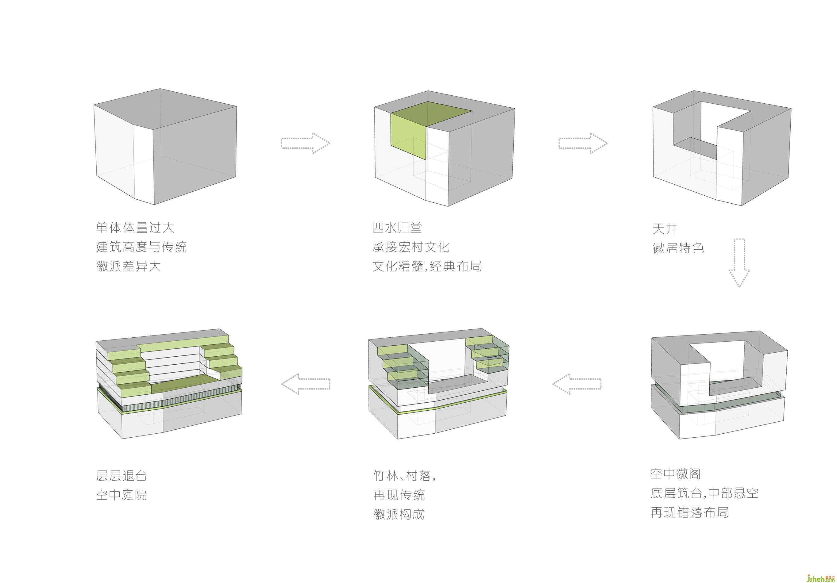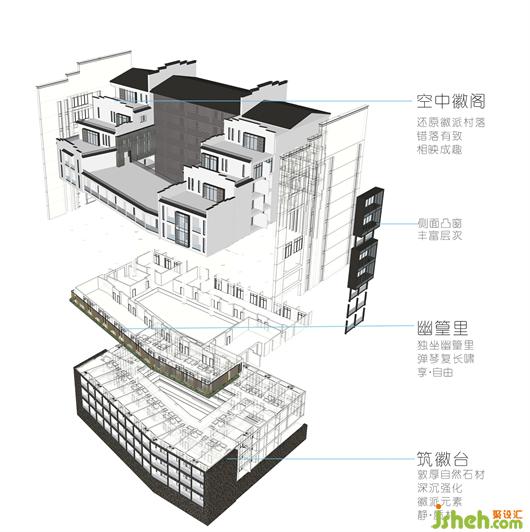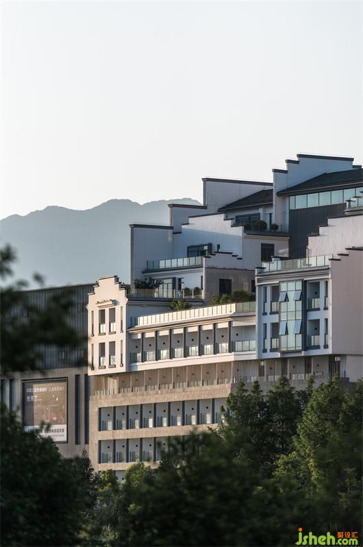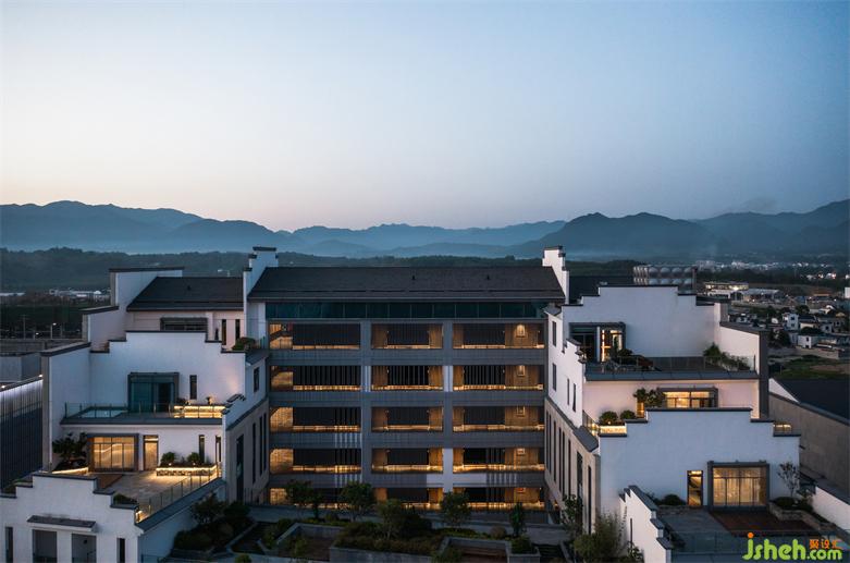 徽派建筑以村落聚集,單體建筑以一層為主,或加一層閣樓。當(dāng)體量龐大、層高9層的酒店將落于此時,設(shè)計(jì)師首先從平衡商業(yè)與文化的角度出發(fā),思考如何用設(shè)計(jì)提供解決方案。