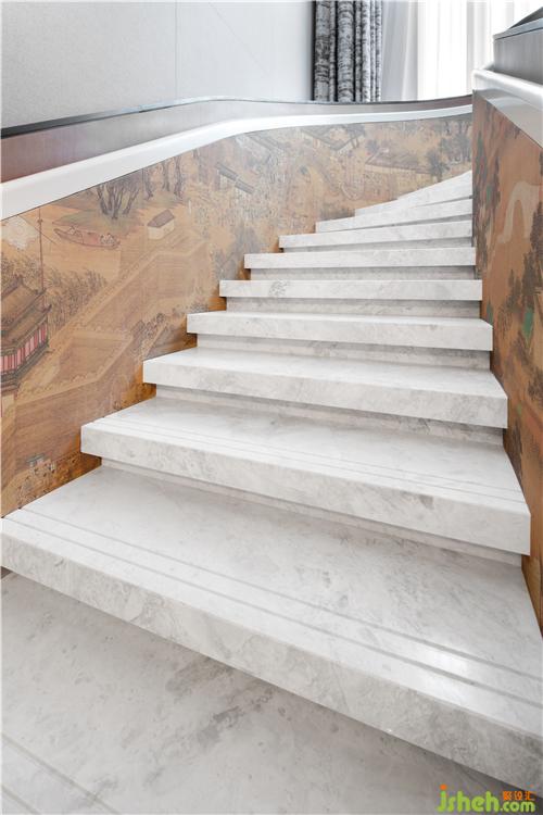 走過門廳走廊,貫穿每層空間的旋轉(zhuǎn)樓梯是整個空間的中心,也是設(shè)計(jì)的一個亮點(diǎn)。在踏步暗藏?zé)魩У囊龑?dǎo)下,踩在白色石材的臺階,仿佛踏上了白色祥云,扶搖而上。環(huán)顧側(cè)面的絹絲清明上河圖,宏偉的建筑,熱鬧的市井,人物活靈活現(xiàn)。北宋盛景盡收眼底。仿佛敘說著一段歷史延綿不斷。