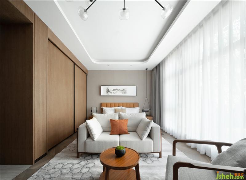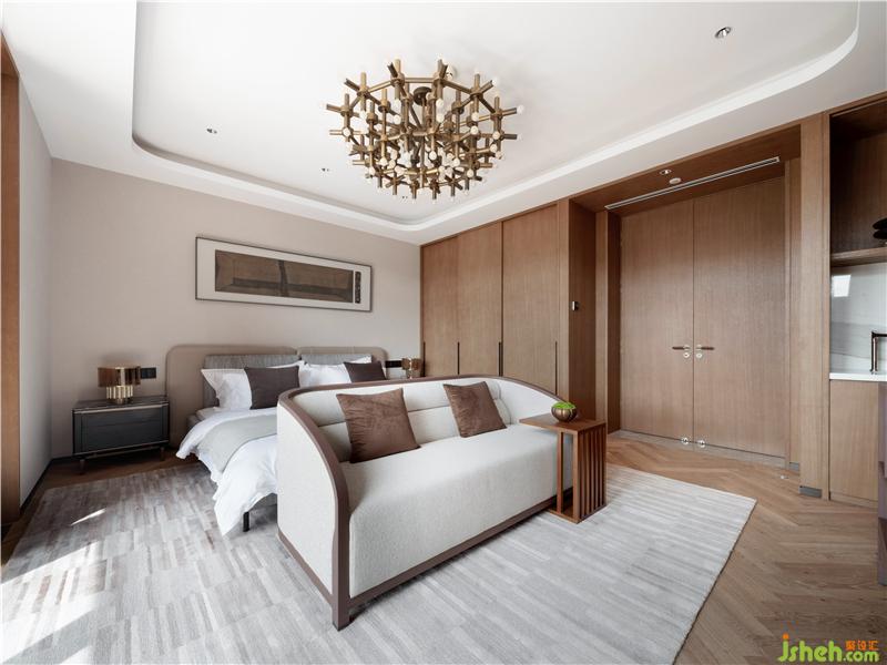 大面積采用了煙熏啞光鐵刀木飾面和素色硬包,簡約大氣以及中式的留白。使主人在以后的生活閱歷中增添自己喜好的收藏和經(jīng)歷、別有一番情趣。主人房盡顯沉穩(wěn)大氣之勢,整體木色淺灰的色調(diào),當(dāng)中以藍(lán)色為點(diǎn)綴,彰顯干練的同時(shí),又不失寧靜的氛圍,讓主人在繁忙的工作中能夠享受生活。