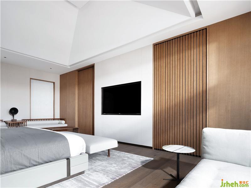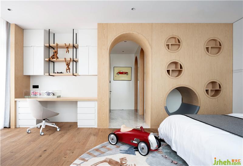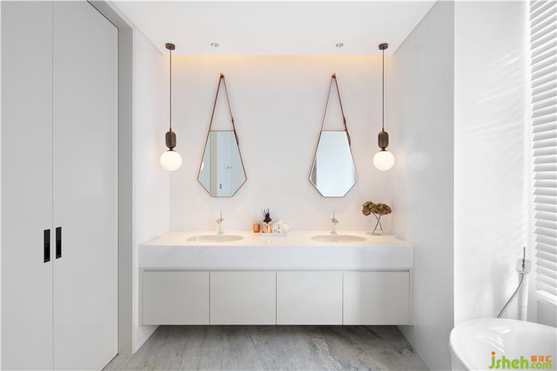 主衛(wèi)設計運用素白石材,圓形頂面張拉膜的運用,詮釋人造光下的沐浴場景,讓主人真正意義上的成為空間的主角。由于空間的頂面結構菱角錯綜復雜,設計師在設計之初結合主人的想法,增加了收納與整理區(qū)域,索性根據(jù)建筑條件新建了一層閣樓區(qū)域用來作為儲藏衣物的區(qū)域,新開了頂面的采光窗,陽光灑下天窗的一剎那,整個空間接受了自然的洗禮。