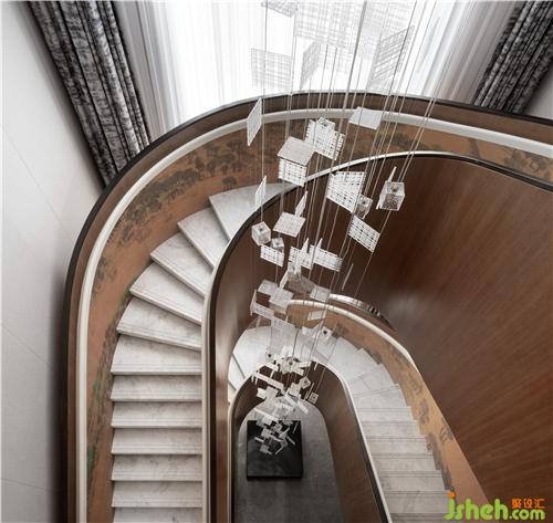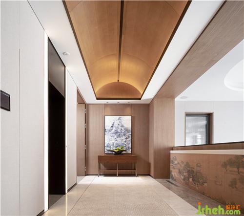 三層走廊盡頭圓形的聚廳,寓意四平八穩(wěn)八方來財?shù)脑O計理念同時在主人轉折與停留的一剎那能夠感受到自然帶來的強大能量作為加持。榫卯結構的原創(chuàng)門拉手內(nèi)嵌麒麟玉石材,寓意為金玉滿堂,麒麟為吉祥之意,體現(xiàn)了主人的品味與地位。走廊拱形的頂面增強空間的莊嚴感。別墅裝飾
