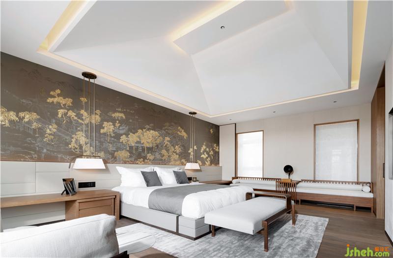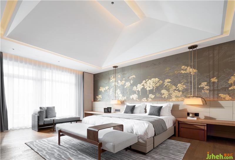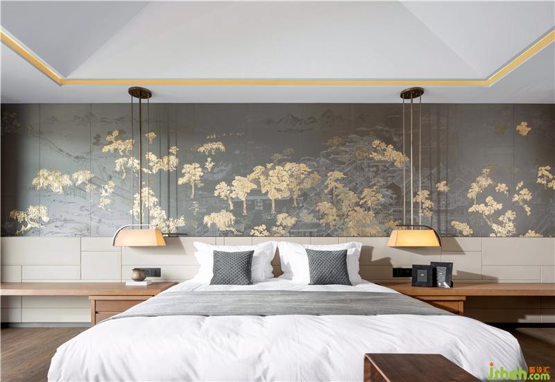 主臥室以開放自由的方式處理,采用半透明的材料分隔,形成格而不透影影綽綽的自然風。床頭巨幅背景機噴手工畫是整個空間的亮點,是清明上河圖的延續(xù),是畫龍點睛錦上添花之落筆。