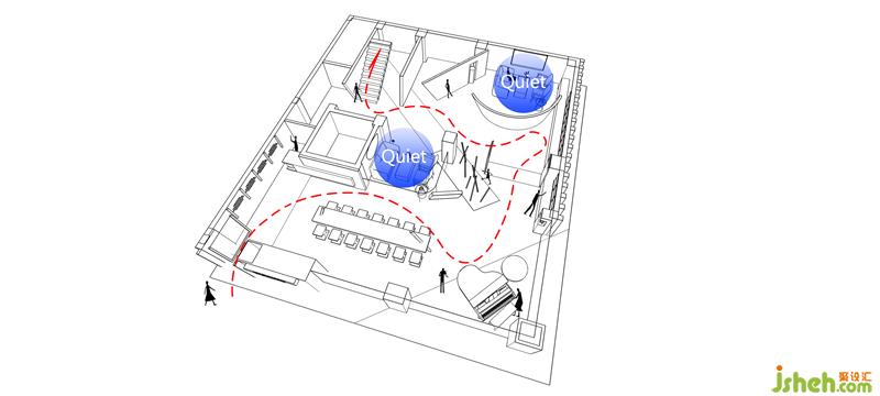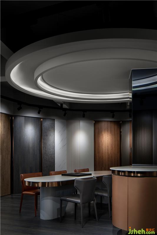圍繞選材間為回形的中心,空間順時針將功能區(qū)域分為各類實例場景,通過動線的推敲,合理地分布并彼此交錯相融。經(jīng)由視覺的元素與空間語匯連接,潛移默化地促成人們在其中的行為,增強空間故事線索的串聯(lián)