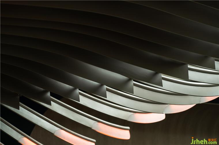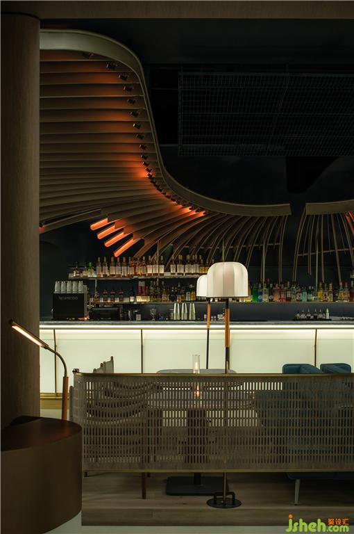 二層為MOC的正餐部分,由于二層的采光和視野極佳,雙塔盡收眼底,我們希望整個(gè)二層將不再需要任何的元素去影響視野,而重點(diǎn)餐廳設(shè)計(jì)出如貝殼狀的天頂,結(jié)合單獨(dú)設(shè)計(jì)的照明裝置,渲染整個(gè)頂部輪廓,讓整個(gè)空間在建筑外部呈現(xiàn)通透和精細(xì)的質(zhì)感。讓BOX·MOC在整條交子大道上格外的亮眼。