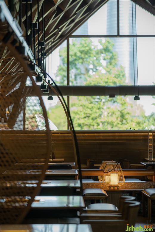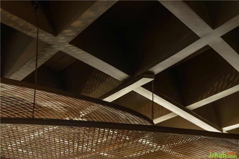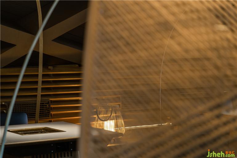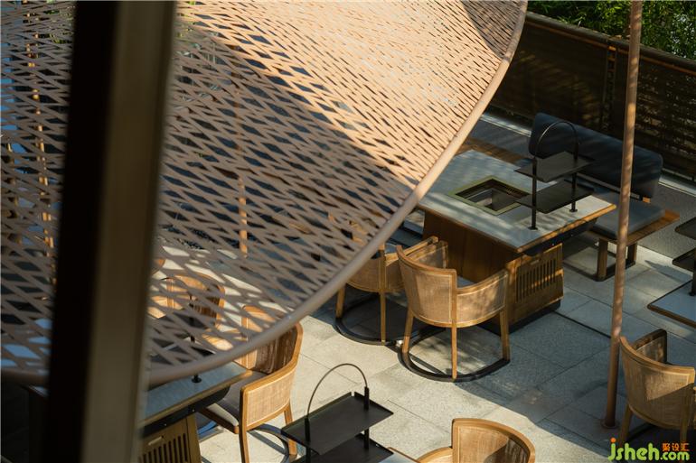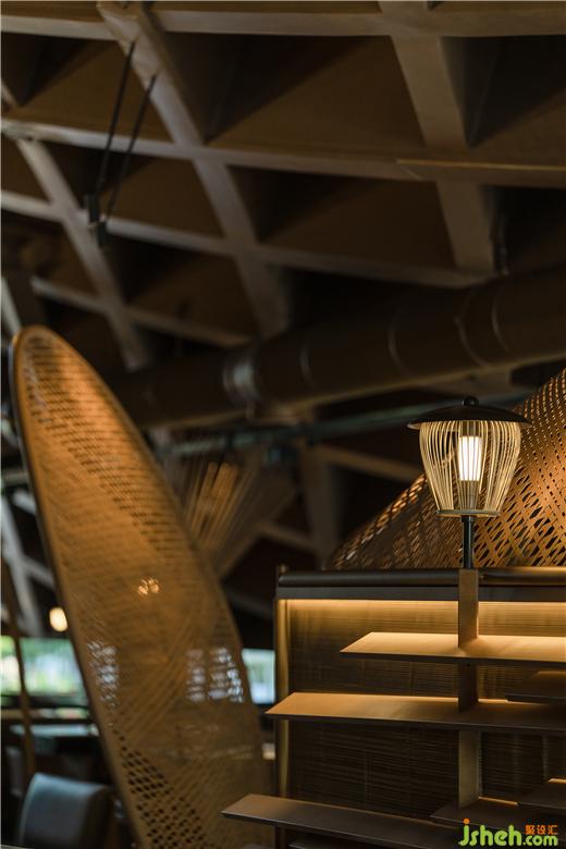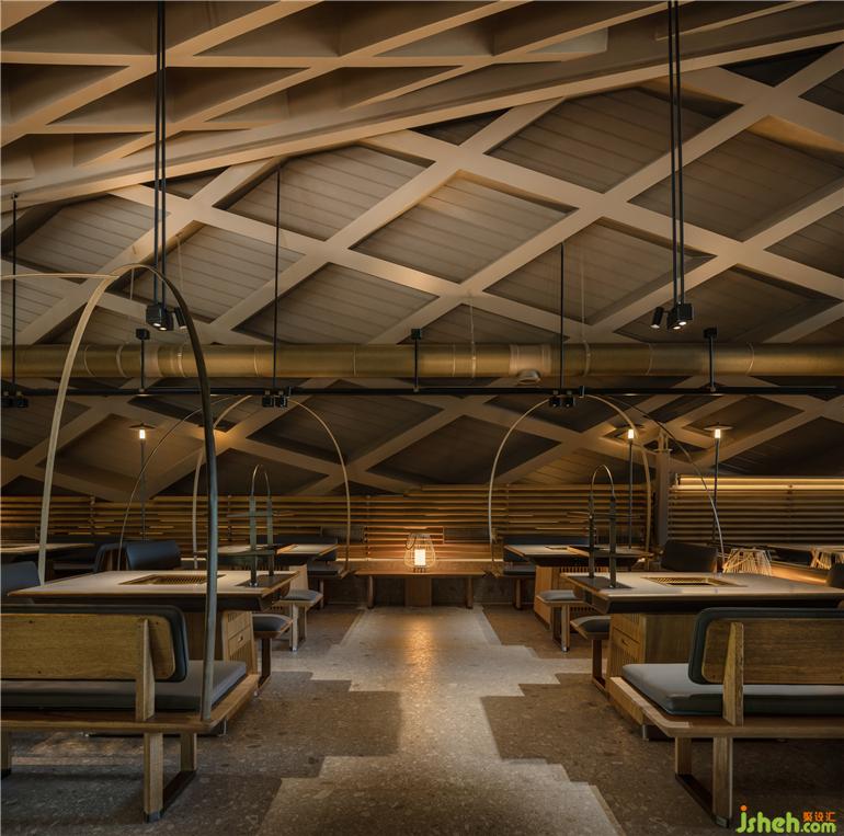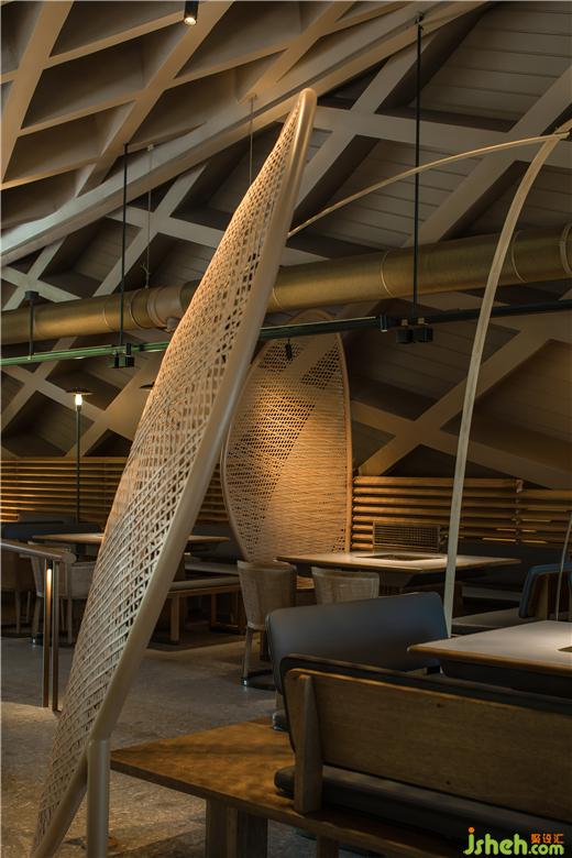 原有建筑中,火鍋店設(shè)計留下了曲線勾勒的柔軟斜頂,也因此有了塑造田園、人家的設(shè)計構(gòu)想。竹編的勞作工具是川西人們最親密的助手,我們將之重新定義,組合成風(fēng)雨蓬,隔間屏風(fēng)等多樣的主題構(gòu)件,也由此展開了所有空間印象的設(shè)計延伸。