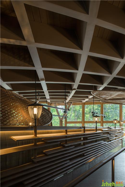 The fluid slanted roof from the original structure is kept and gave rise to the design idea of an idyllic life.The bamboo-woven tools for manual labour were the best assistants of the people in west Sichuan. We have reinterpreted them and created many related interior components, including awnings and screens, which became an extension of the spatial impression.