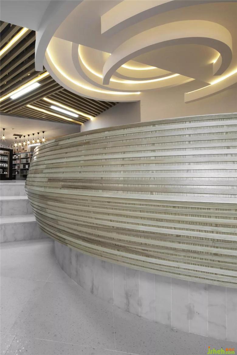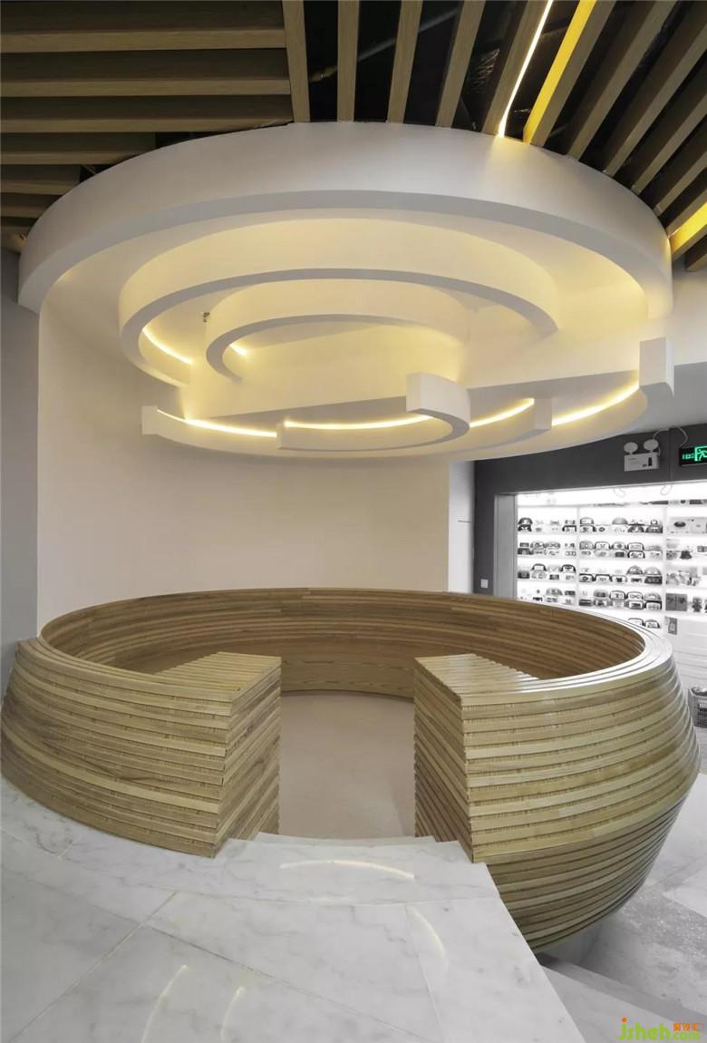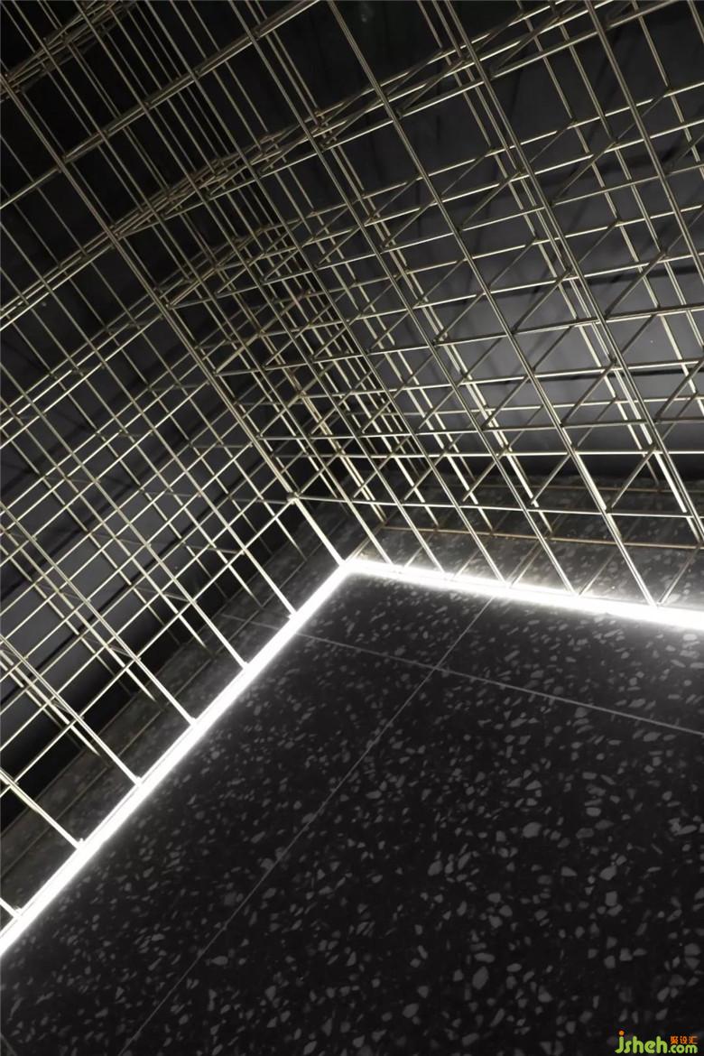 右邊的接待區(qū)是一個(gè)圓形下沉式木制空間,旨在營(yíng)造自然、舒適的交流場(chǎng)所。左邊是一個(gè)縱橫交錯(cuò)的金屬網(wǎng)格矩陣,藉由這種密集的形態(tài),給人帶來探索未知世界的可能。并通過三個(gè)不同的出入口,連通了中心展示區(qū)和兒童產(chǎn)品區(qū)。