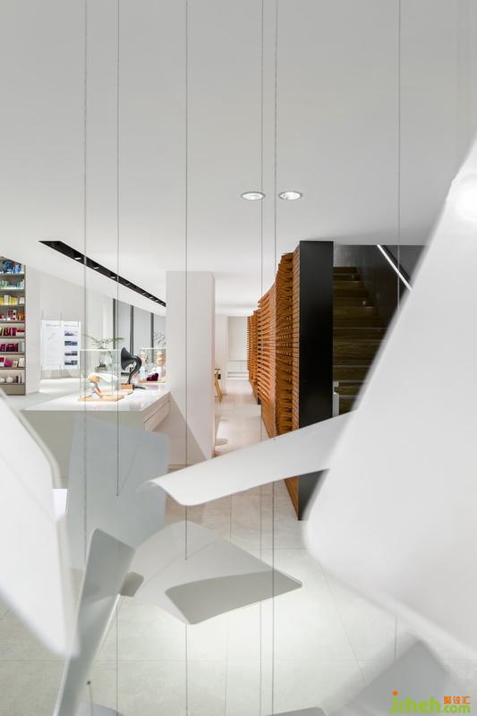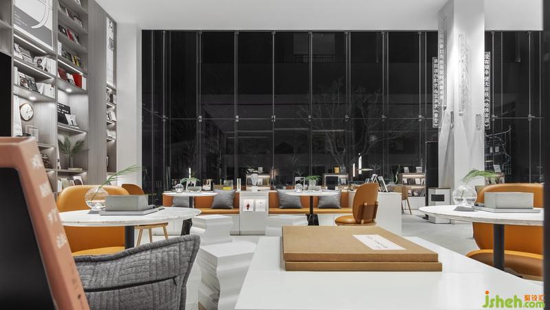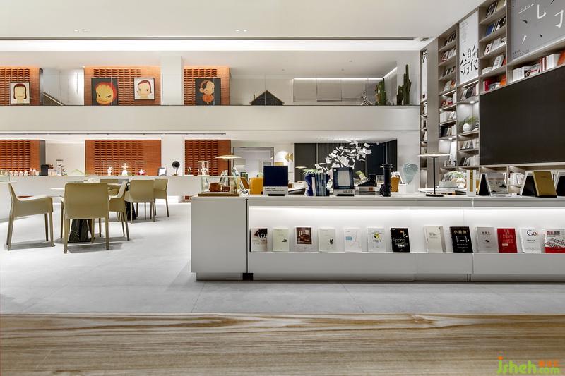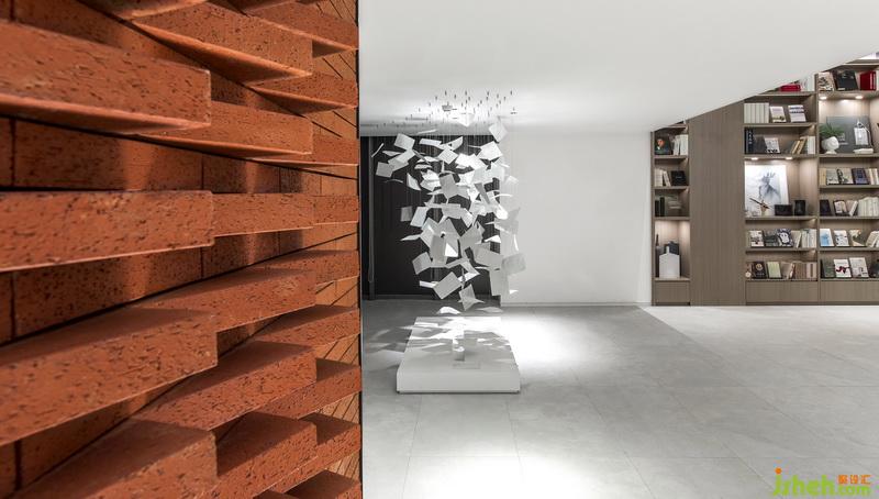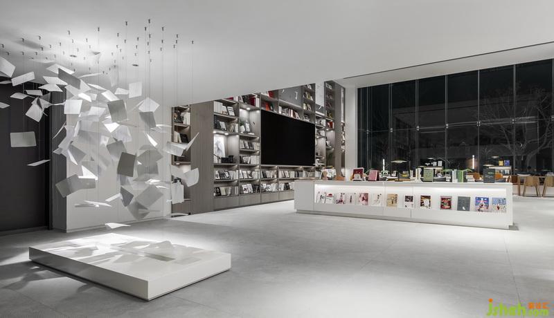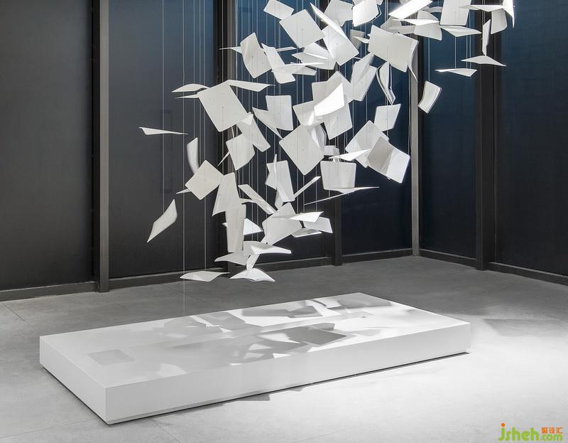 室內(nèi)設(shè)計(jì)師試圖打破銷售中心商業(yè)化設(shè)計(jì)的桎梏模式,以人文為基底,尋覓藝術(shù)的美妙。書墻一旁的書頁藝術(shù)裝置自天花垂吊而下,宛如空中飛舞的白鴿,這是獻(xiàn)給獻(xiàn)給愛書者的禮物:人類書寫著情感、時(shí)間與死亡,而書籍使這一切永不終結(jié),永遠(yuǎn)指導(dǎo)著方向。