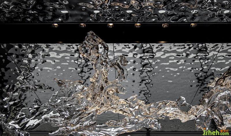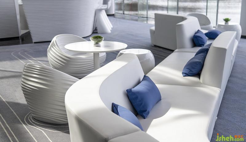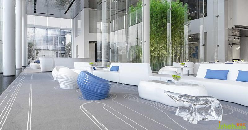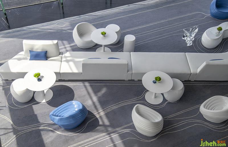 各個空間相互串通,人于空間內(nèi)游走,頗有移步異景之趣。洽談區(qū)呈條帶狀,地毯紋路如盈盈流水,不規(guī)則座椅作溪石,地毯曲線宛如“水”遇“溪石”所呈的蜿蜒曲折之狀,于空間中增添趣味。