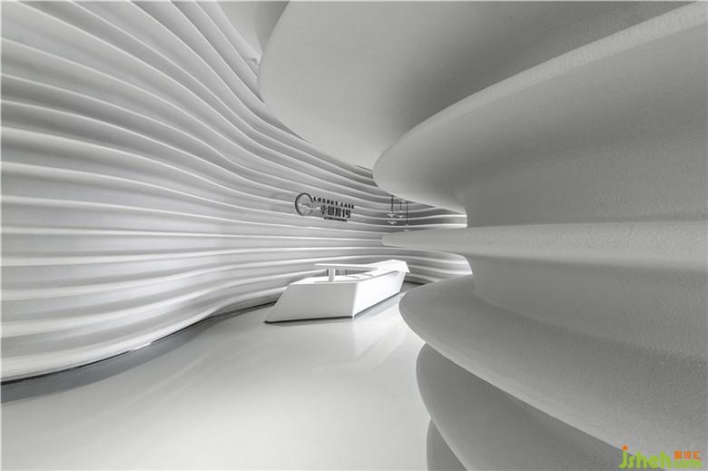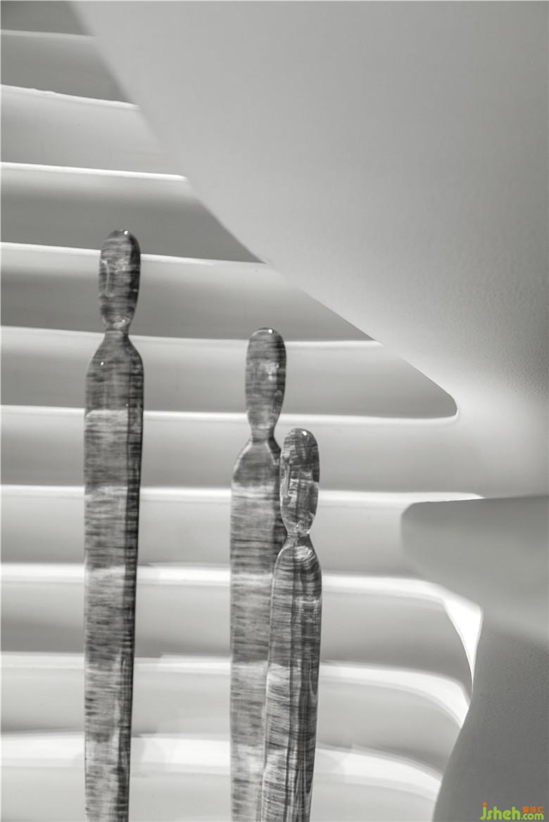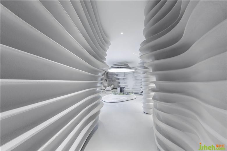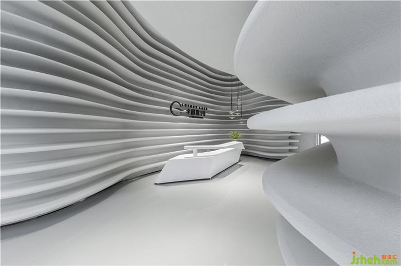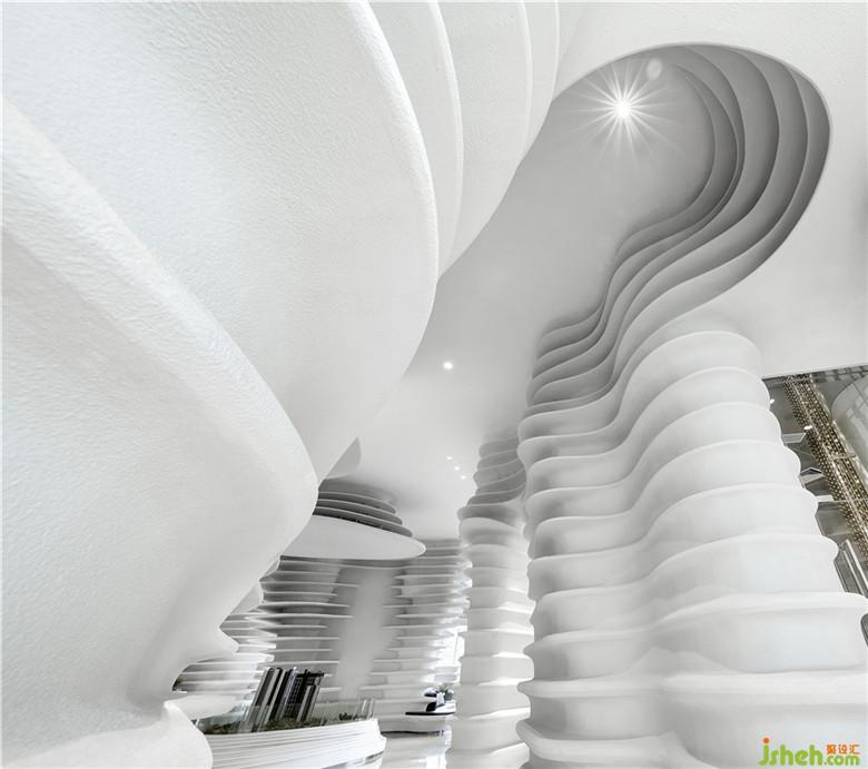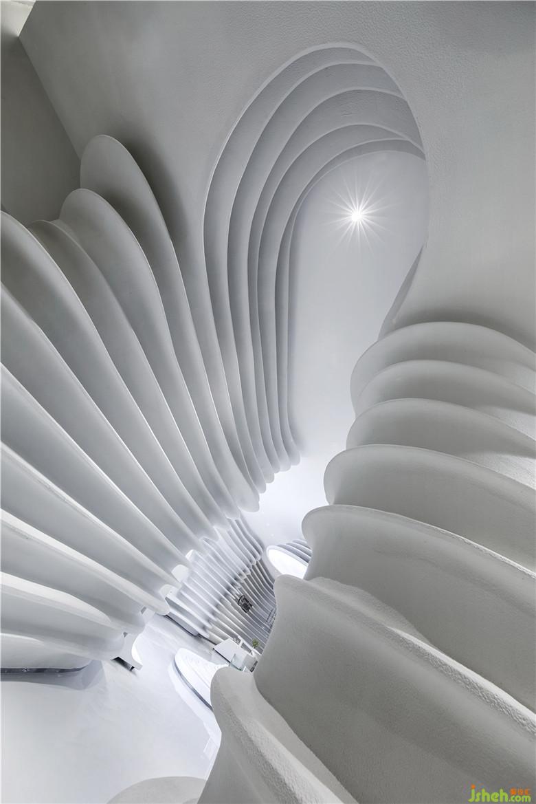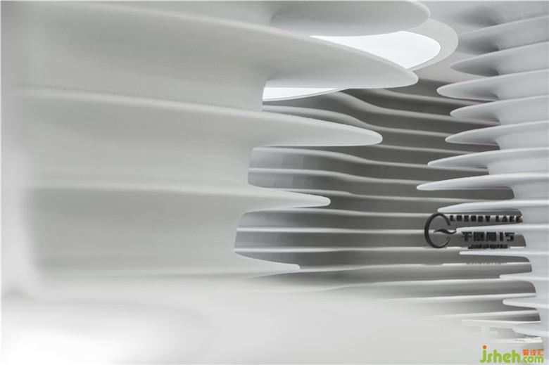 碧波蕩漾,泛起陣陣漣漪,水紋宛如縠皺之形。設(shè)計師將這生動的瞬間捕捉,將其形態(tài)具象化,揉入室內(nèi)結(jié)構(gòu)當(dāng)中,勾勒出立體的輪廓。