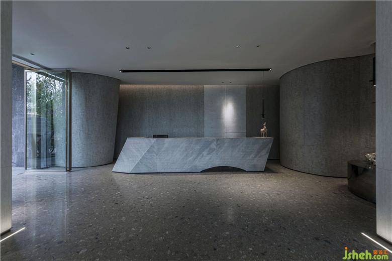 前臺接待區(qū)以大面積的灰調(diào)為主,斜面接待臺與云石肌理結(jié)合,趣味形狀碰撞質(zhì)感材料,現(xiàn)代感更強烈。底部拱形樣式,于空間之始,拋下了引子。